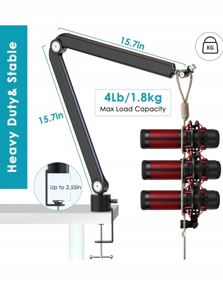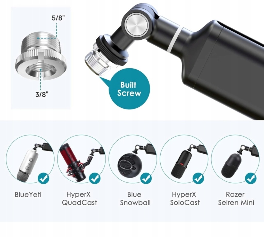 Uniwersalne profesjonalne ramię mikrofonu metalowego: dzięki adapterowi od 3/8" do 5/8" ten stojak mikrofonowy jest kompatybilny z większością ciężkich lub lekkich mikrofonów oraz różnymi modelami amortyzatorów mikrofonowych.