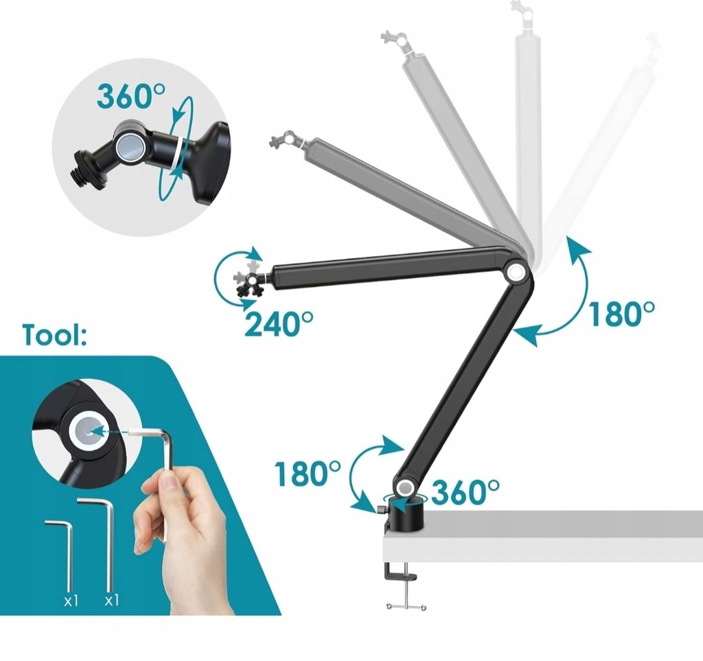 Wysokowydajne ramię mikrofonu: ulepszone ramię mikrofonu zapewnia 5 regulowanych przegubów, co zapewnia większy wybór możliwości ruchu od ponad 180° do 360°. Dzięki odległości poziomej/pionowej do 80 cm i pełnemu obrotom o 360° możesz umieścić mikrofon USB pod dowolnym kątem. Absolutnie stabilny, bez zwisania.