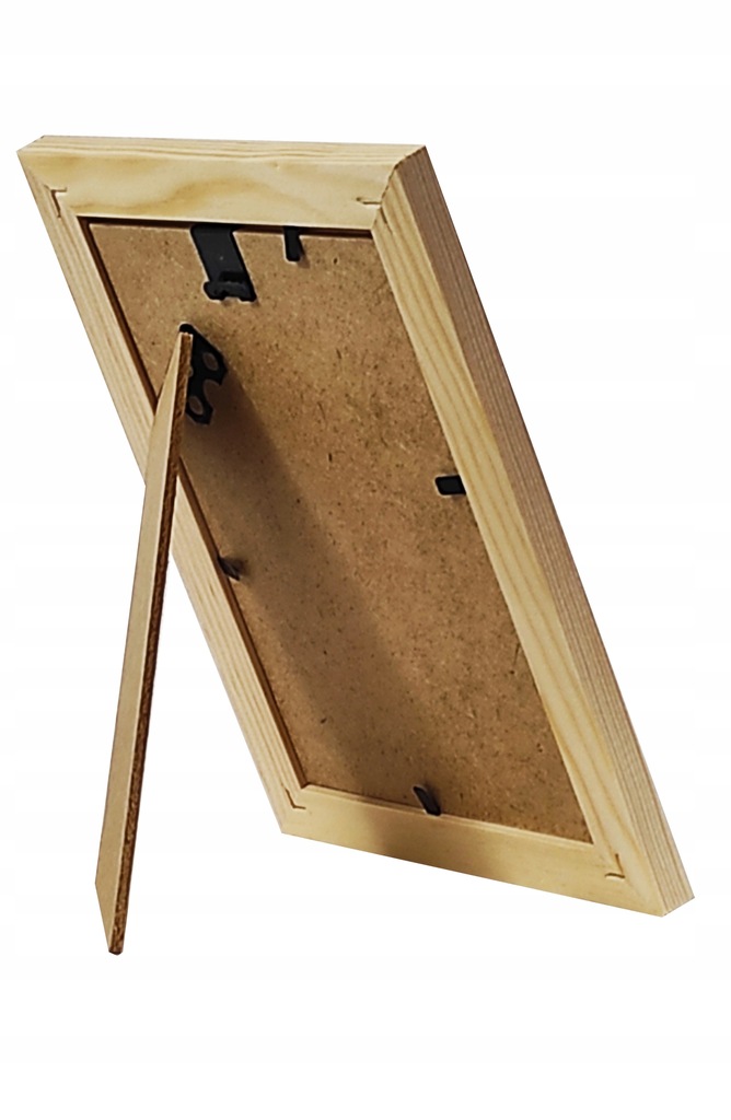 Plecy ramki wykonane są z wysokiej jakości płyty HDF i wyposażone w wieszaki umożliwiające powieszenie jej zarówno w pionie jak i poziomie oraz nóżkę.