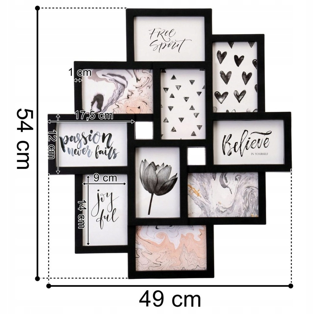 Ma miejsce aż na 10 kadrów 10x 15 cm w pionie i poziomie, co pozwala na stworzenie bardzo ciekawych kolaży. Zdjęcia zabezpieczysz bezpieczną, sztywną folią PVC. Dzięki temu rama będzie znacznie lżejsza od tradycyjnej ze szkłem.