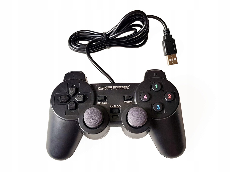 Gamepad EG102 Esperanza - wyposażony jest w dwa silniczki powodujące efekt wibracji. Urządzenie posiada kabelek USB, 6 przycisków analogowych, cztero kierunkowy krzyżak oraz dwie analogowe gałki