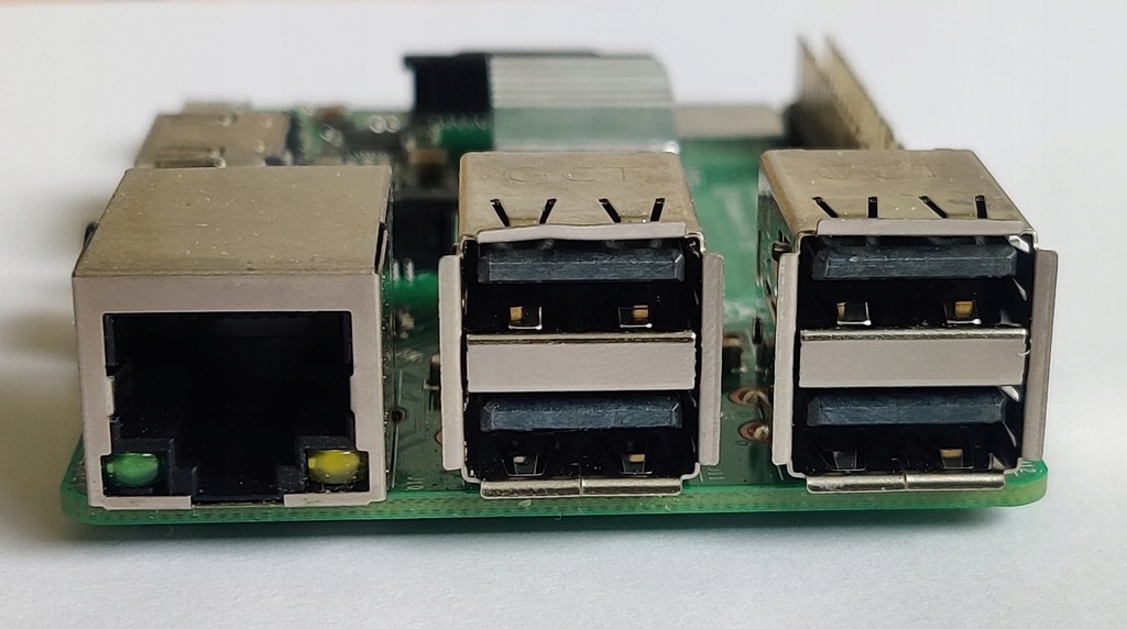 Popularny minikomputer Raspberry Pi w wersji 3 B+. Ten model wyróżnia bardziej wydajny procesor Broadcom BCM2837B0 quad-core 64-bitowy ARM-8 Cortex-A53 1,4 GHz. Ponadto płytka posiada dwuzakresowe WiFi 2,4 GHz i 5 GHz, Bluetooth 4,2 / BLE, port Ethernet o prędkości do 300 Mb/s oraz możliwość zasilania przez PoE.