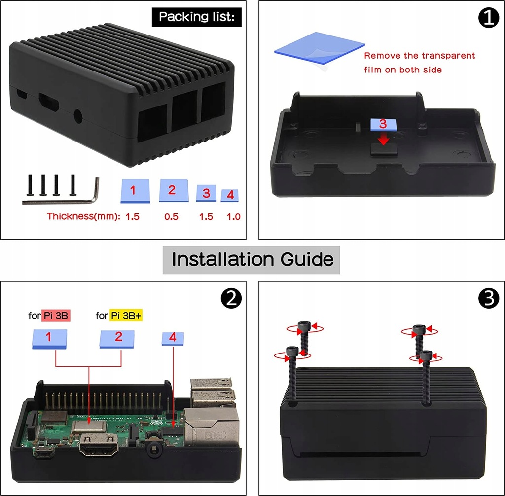 - Lista pakowania 1 x aluminiowa obudowa na Pi3; 4 x podkładki termiczne; 1 x zestaw śrub montażowych
