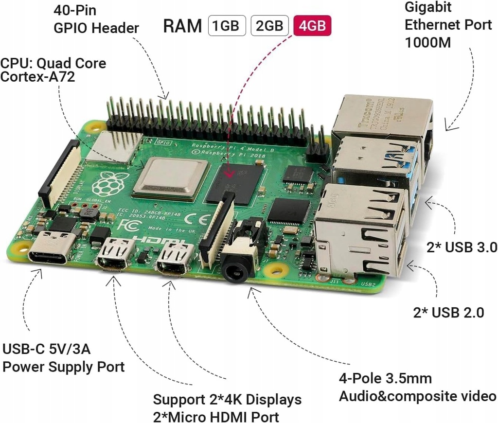 - W zestawie : Raspberry Pi 4 Model B 4GB RAM , dokumentacja producenta, opakowanie zastępcze.