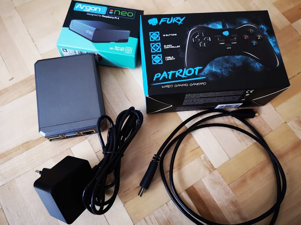 oryginalny zasilacz raspberry,obudowa aluminiowa która jest jednoczenie radiatorem- Argon neo, kabel micro hdmi, oraz game pad na usb, wszystko widoczne na zdjęciach. Raspberry przez krótki okres służyła jako konsola do gier.