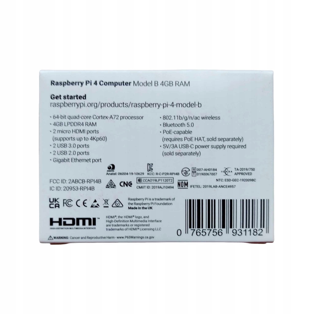 Raspberry Pi 4 Model B wyposażony jest w 64-bitowy czterordzeniowy procesor Cortex-A72 taktowany zegarem 1,5 GHz, umożliwia podłączenie dwóch monitorów w rozdzielczości do 4K przy częstotliwości wynoszącej 60 klatek/sekundę, ma 4 GB pamięci RAM, dwupasmowy moduł WLAN 2.4/5.0 GHz, Bluetooth 5.0/BLE, porty Gigabit Ethernet, USB 3.0 i możliwości w zakresie PoE (za pośrednictwem oddzielnego dodatku PoE HAT).