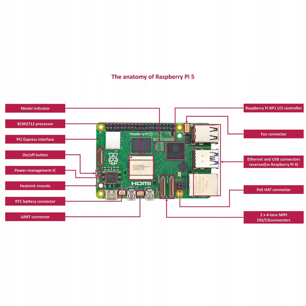 Płytka obsługuje dwuzakresowe Wi-Fi (2,4 GHz i 5 GHz), Bluetooth 5 BLE oraz szybki port Ethernet (1000 Mb/s), z możliwością zasilania przez PoE przy użyciu nakładki PoE+ HAT. Raspberry Pi 5 zawiera także 40-pinowe złącze GPIO, złącze karty microSD na system operacyjny oraz standardowe otwory montażowe.