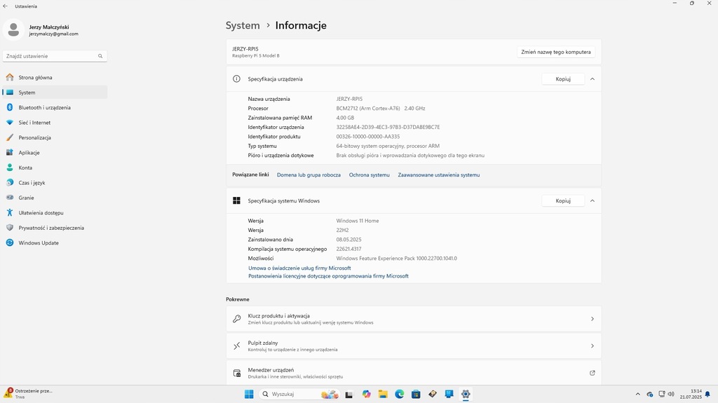 Raspberry Pi 5 4GB RAM + aktywne chłodzenie Zainstalowany WIN11