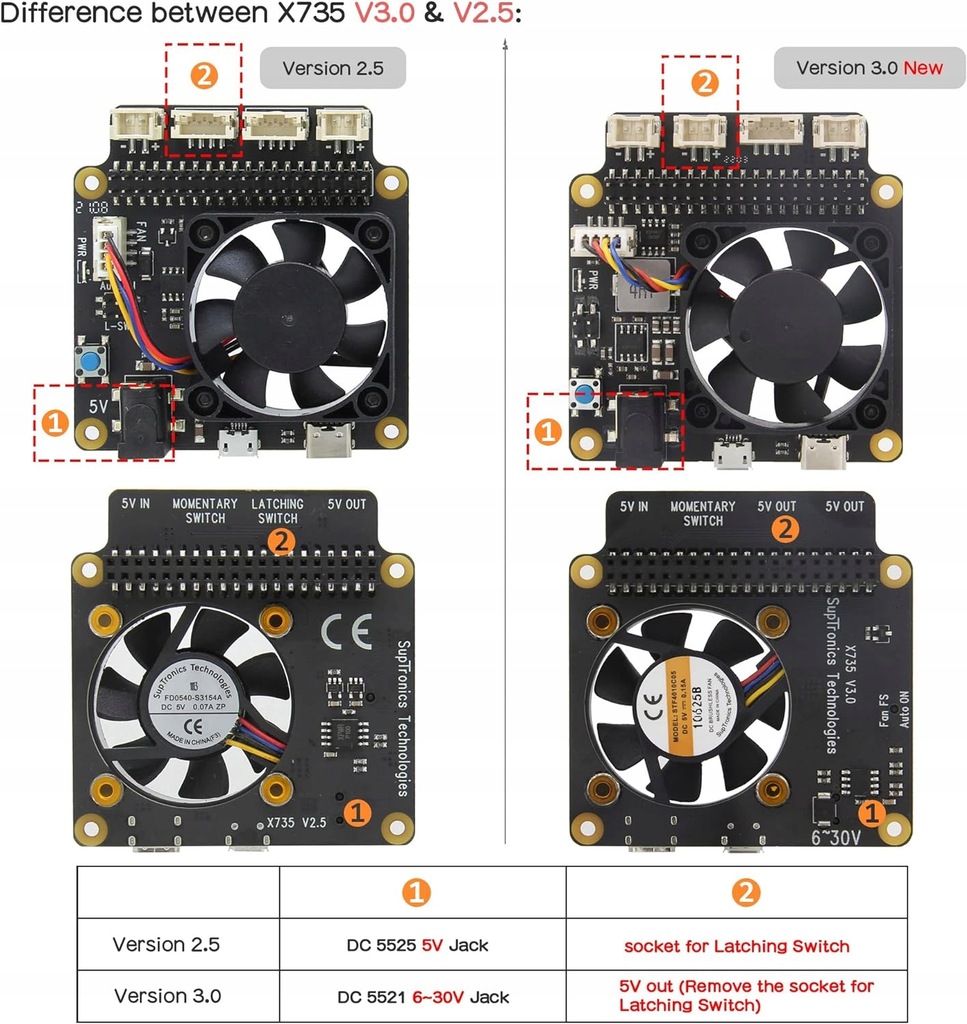 - Nowa wersja: X735 V3.0 Z cichym wentylatorem PWM, który może kontrolować prędkość wentylatora za pomocą kodu Pythona, skrypt dla wentylatora PWM: wiki.geekworm.com/X735_V2.5_Software