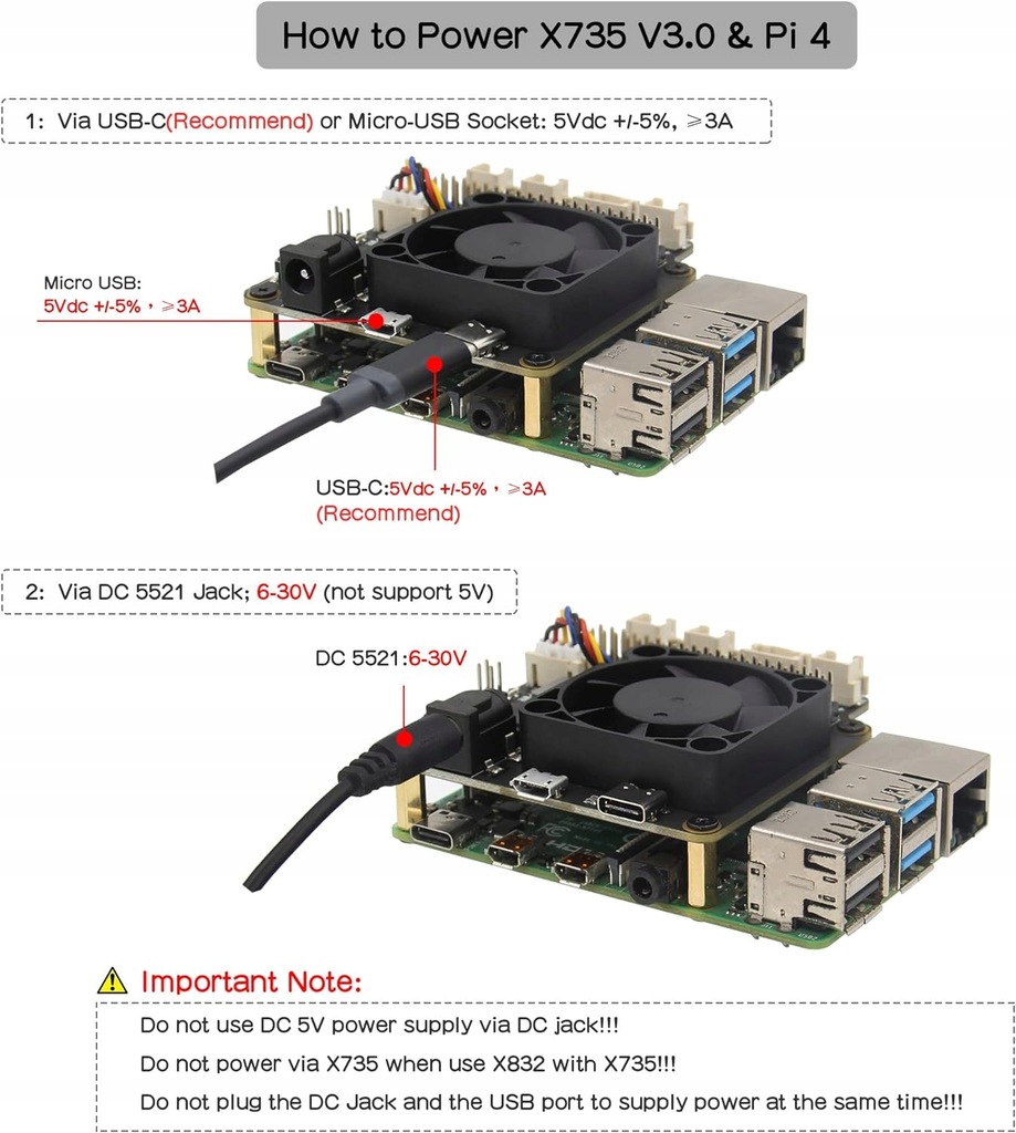 - Jak zasilać: Przez gniazdo USB-C lub Micro-USB: 5Vdc+/-5%, ≥3A; LUB przez gniazdo DC 5521: 6–30 V (nie obsługuje 5 V)