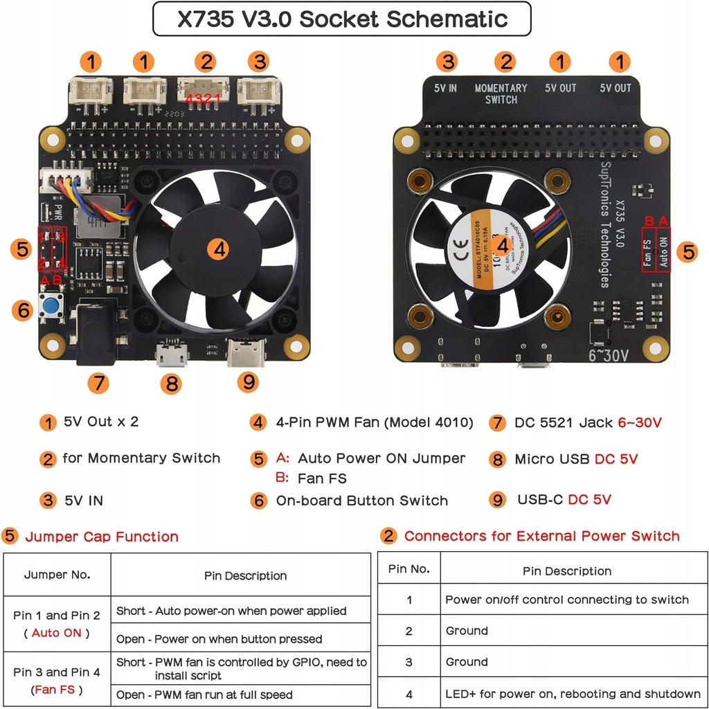 - Wielofunkcyjna karta rozszerzeń Inteligentne i bezpieczne zarządzanie energią, bezpieczne wyłączanie i pełne wyłączanie zasilania za pomocą oprogramowania, wentylator chłodzący PWM, wejście napięciowe DC 6 V-30 V.
