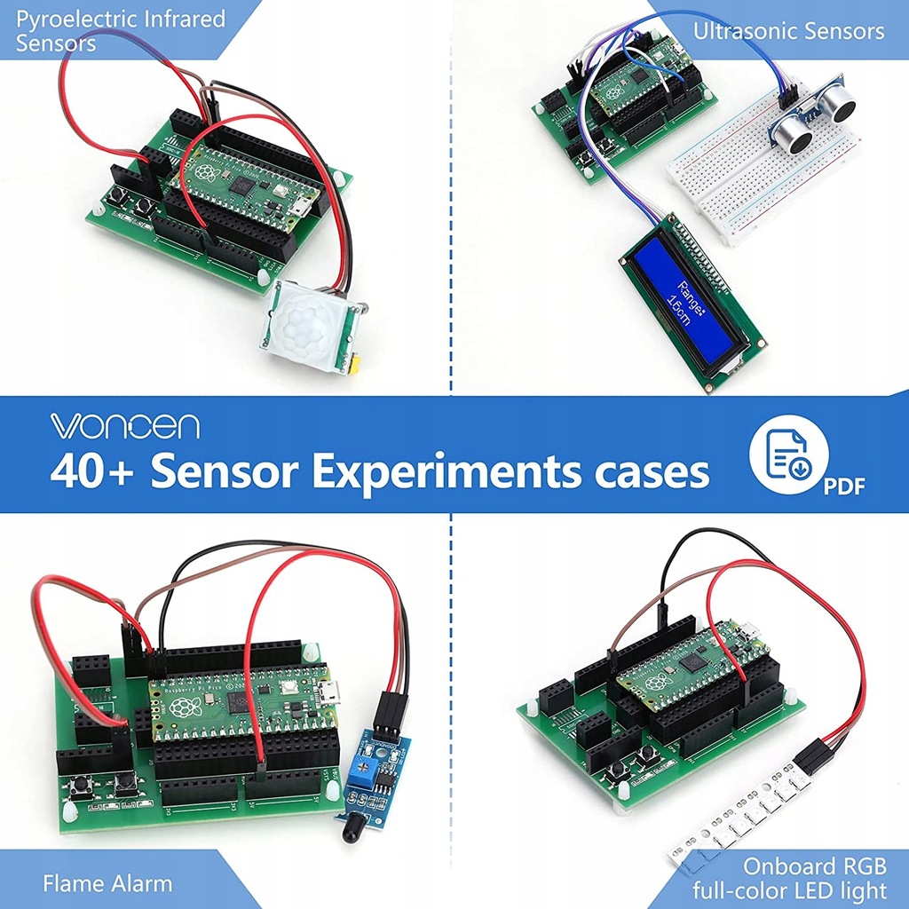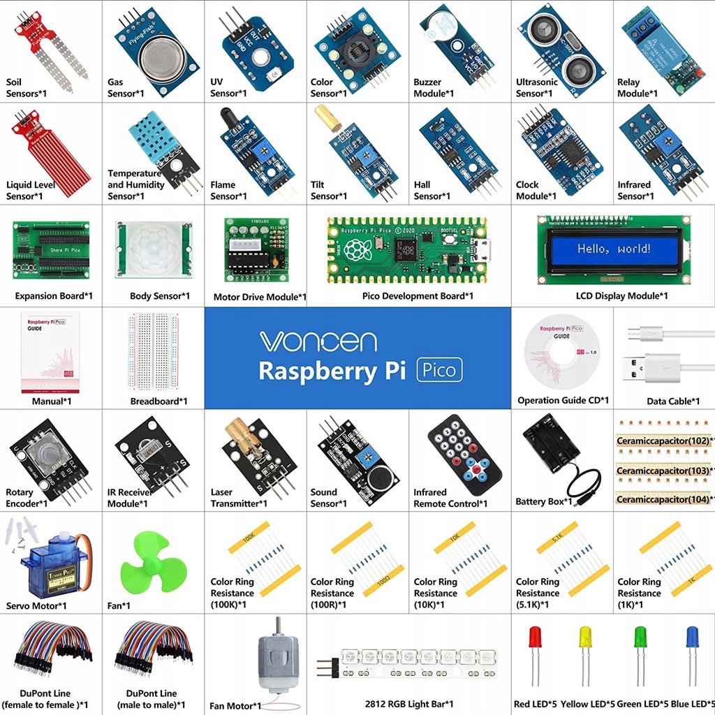 Raspberry Pi Pico, oprócz mikrokontrolera RP2040, jest wyposażony w 46 rodzajów akcesoriów, łącznie 181, np. kabel danych, opornik, kondensator i sensory: czujnik temperatury, czujnik gazu, czujnik koloru, czujnik płomienia, czujnik cieczy, czujnik wilgotności i czujnik dźwięku itp. Dzięki naszemu zestawowi Pico możesz łatwo przeprowadzać małe eksperymenty w domu.