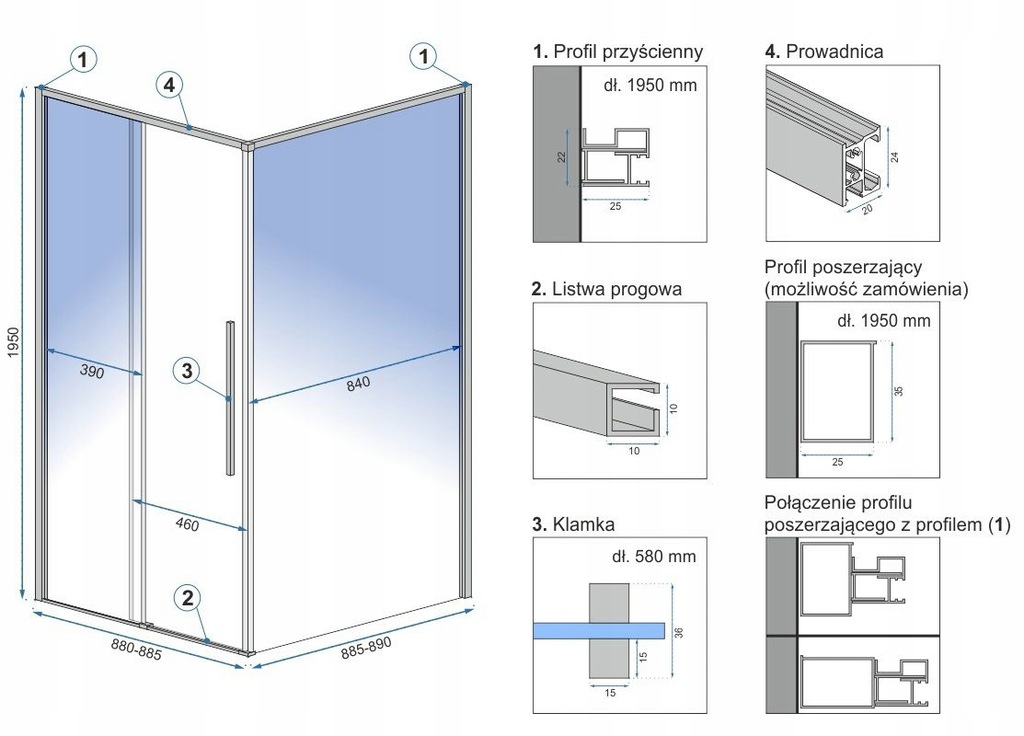 W komplecie znajduje się wszystko, co potrzebne do zamontowania kabiny: uszczelki, uchwyt, zawiasy