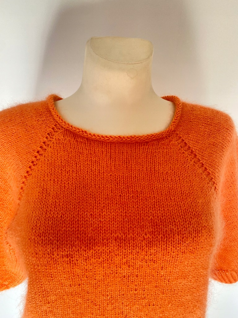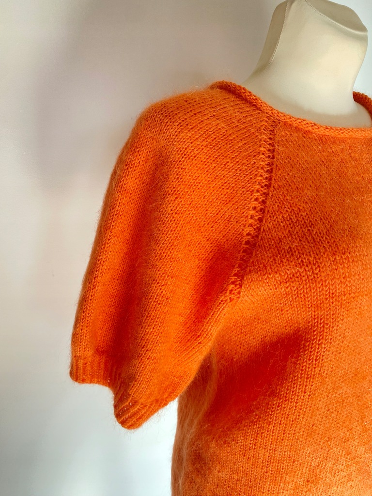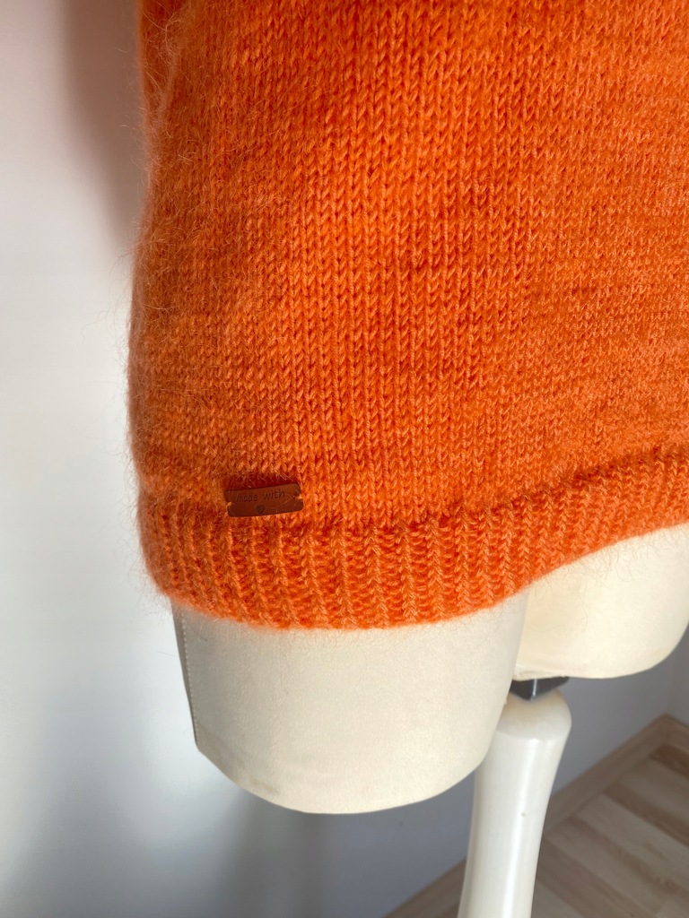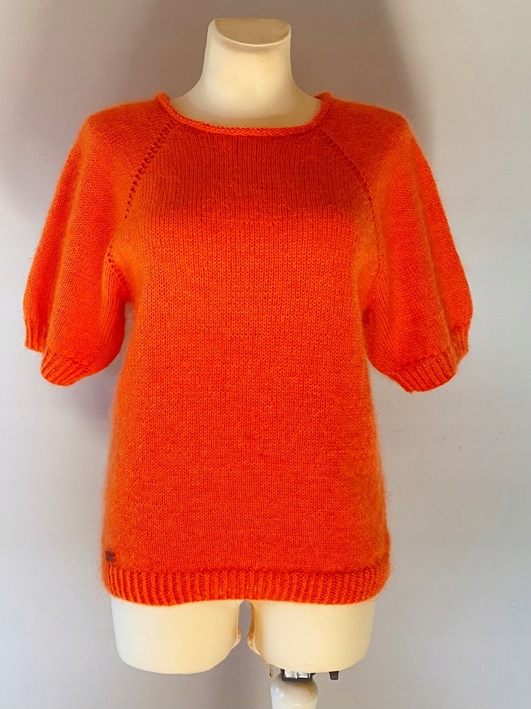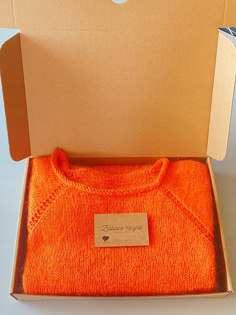 Ręcznie robiona bluzka wykonana z dwóch ekskluzywnych włóczek ; (100% wełna baby merino ) i (moher 75% ,jedwab 25% ) . Wymiary( mierzone na płasko) : długość-64 cm, szerokość od pachy do pachy -50 cm ,szerokość ściągacza na dole-42 cm ,rękaw od pachy -15 cm. Kolor -orange .Bluzka jest miękka i miła dla ciała .Zapakowana w ozdobne pudełko.