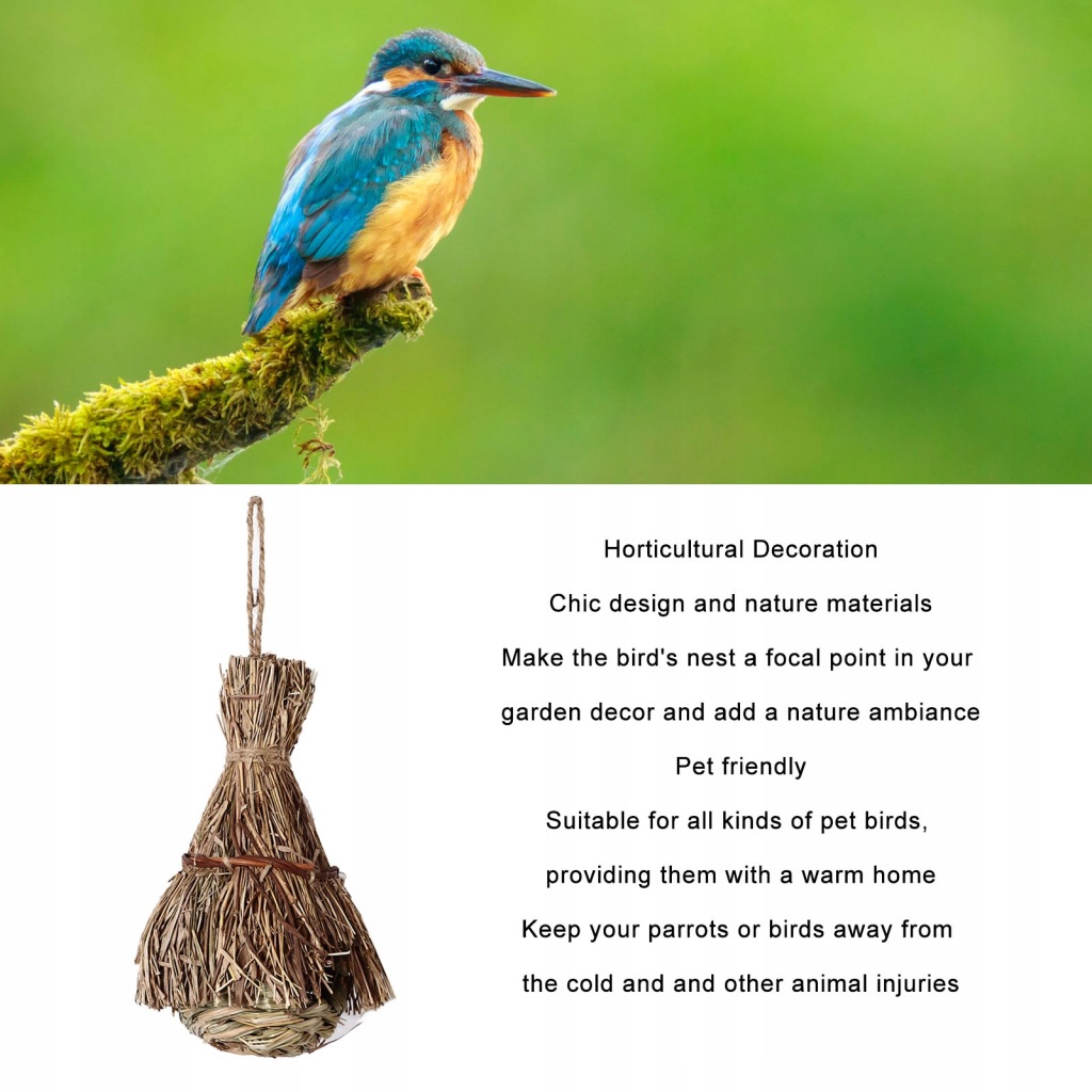 2. MATERIAŁ PRZYJAZNY EKOLOGICZNIE: Gniazdo ptaka z trawy wykonane jest z naturalnej trawy hibiskusa i strzechy, która jest bezpieczna i nieszkodliwa oraz bardzo przyjazna dla ptaków i środowiska.
