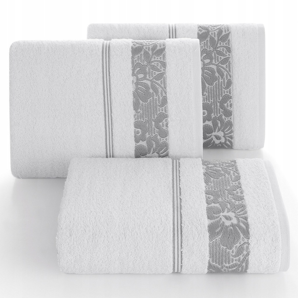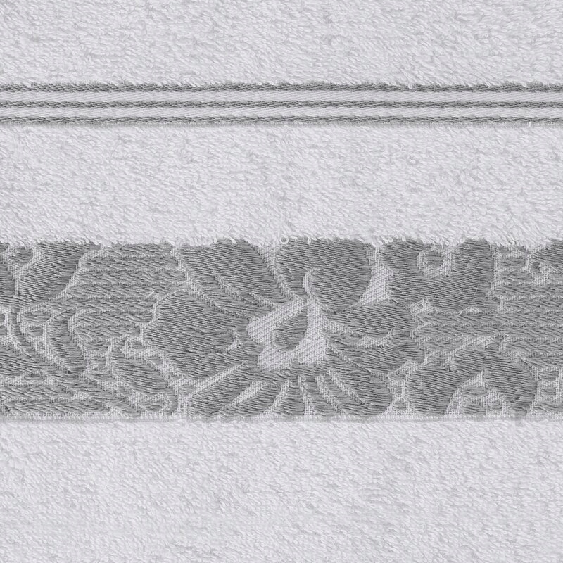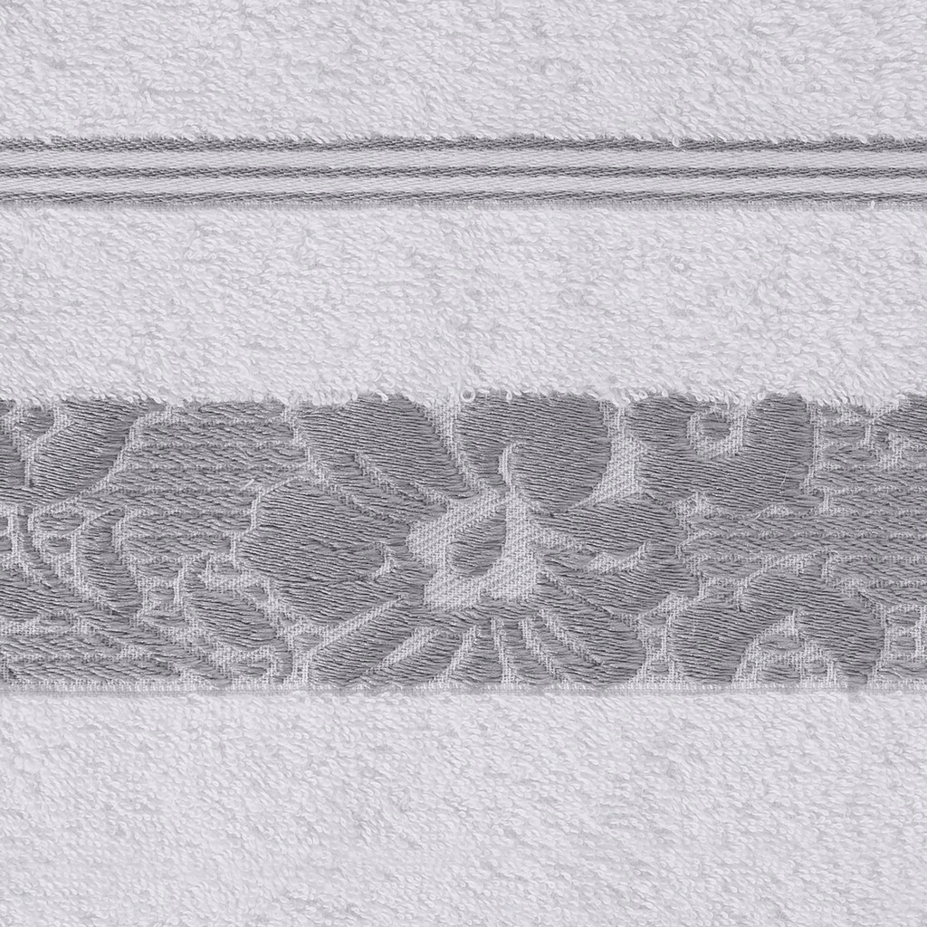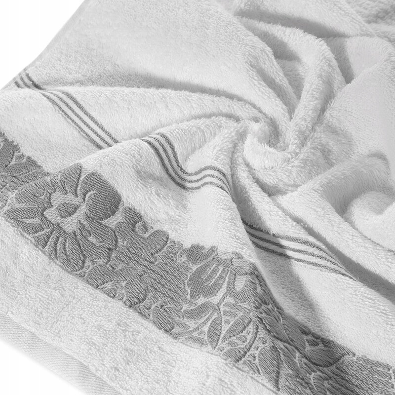 Elegancki ręcznik kąpielowy z miękkiej i chłonnej bawełny frotte zdobiony żakardową bordiurą z kwiatowym wzorem w dopasowanym kolorze. Bardzo miękki i przyjemny szerokość: 70 cm, długość: 140 cm, kolor: biały, Gramatura: 500 GSM, Skład: 100% bawełna; część ozdobna: 70% poliester, 30% bawełna