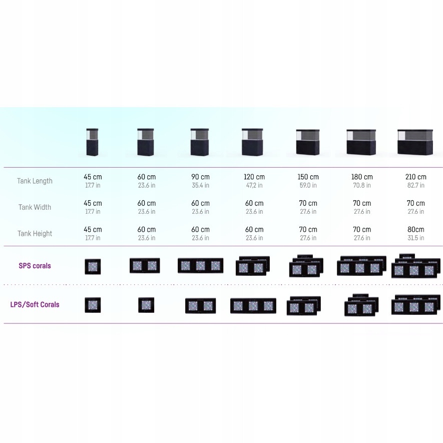 - Kanały: White 5 700 K x2, Blue 470 nm x4, Royal Blue 450 nm x9, Violet 420 nm x4, UV 400 nm x2, Green 530 nm x1, Red 660 nm x1