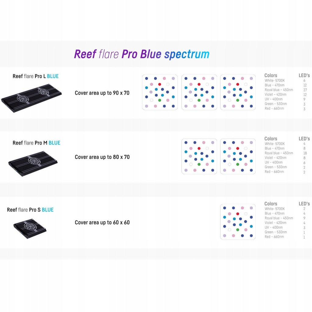 Parametry świetlne lampy Reef Flare Pro Blue wyróżnia niebieskie spektrum. Posiada 7 sterowalnych kanałów, które możemy dowolnie dostosować do swoich potrzeb. Ustawienia najlepszych dla nas parametrów oświetlenia dokonamy za pomocą aplikacji Smart Reef na urządzenia mobilne. W aplikacji mamy możliwość regulacji tradycyjnymi suwakami, istnieje także opcja ręcznego wpisania pożądanych mocy każdego kanału w procentach. To bardzo wygodne rozwiązanie umożliwia niezwykle precyzyjne sterowanie lampą.