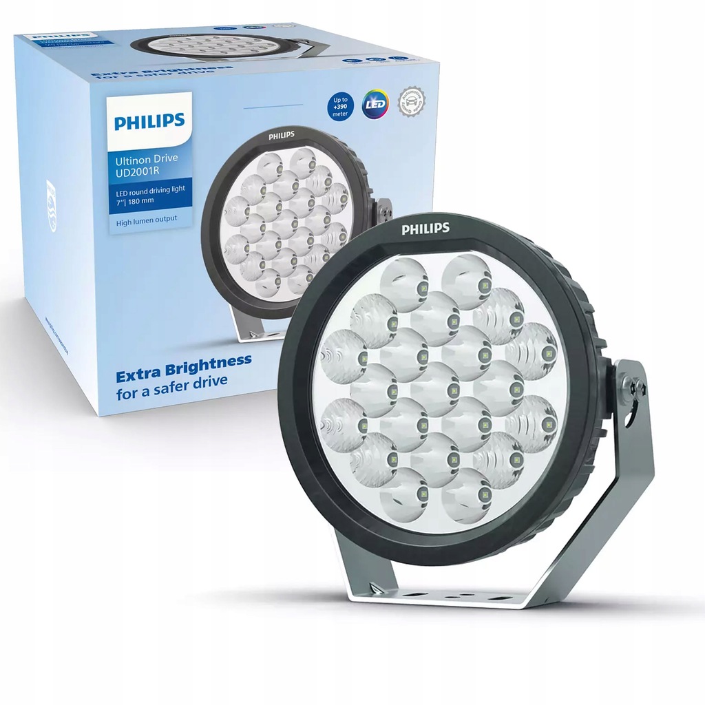 emitowanemu na odległość do 390 metrów. Światło drogowe LED Ultinon Drive 2001R jest w 100% zgodne z przepisami drogowymi dzięki wytrzymałej, jednoczęściowej konstrukcji i zaawansowanej technologii chłodzenia. Jest odporne na wodę, kurz, rdzę i uderzenia.