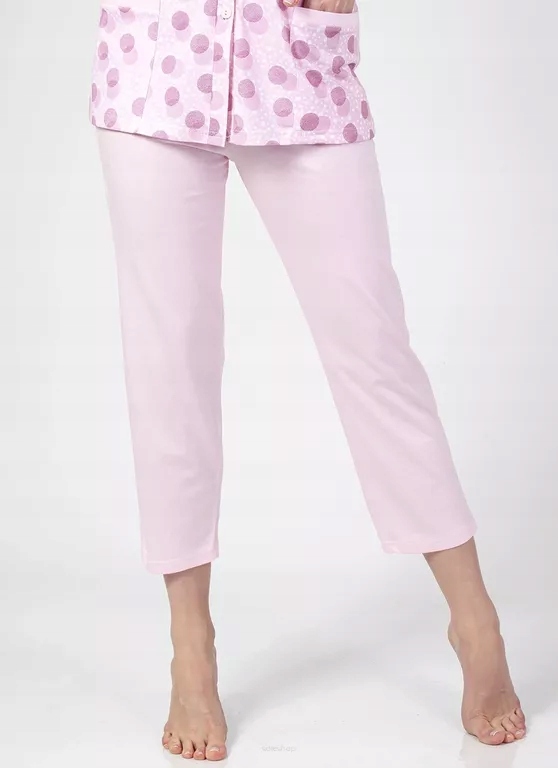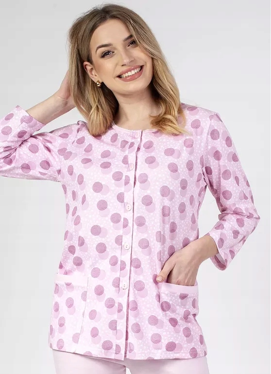 Materiał: 100% Bawełna. Wykonana z czystej, najwyższej jakości bawełny. Dekolt obszyty ozdobną lamówką. Bluzka rozpinana na guziki przez całą długość. Praktyczne kieszenie umieszczone z przodu bluzki. Wzór w groszki. Rękaw 3/4, spodnie 7/8