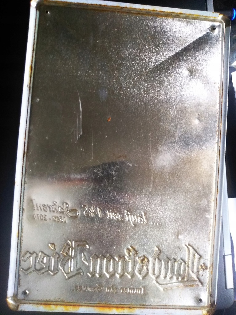 19x29 cm, oryginalna, używana, tłoczona blacha, 2014 - seria wyprodukowana z okazji 145-lecia browaru. Niewielkie ślady rdzy na odwrocie