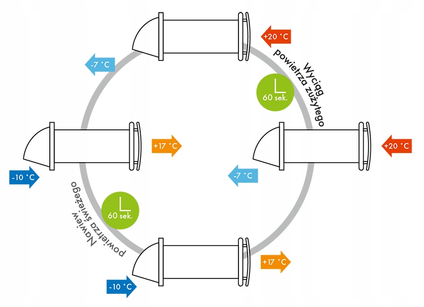 Zasada działania: Rekuperator działa w systemie dwóch 60-sekundowych cykli:
