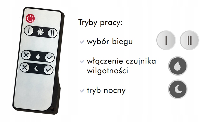 - Pilot zdalnego sterowania – Umożliwia wygodne zarządzanie urządzeniem. Dzięki niemu można łatwo włączyć/wyłączyć wentylator, regulować jego bieg, włączyć/wyłączyć czujnik wilgotności oraz ustawić tryb nocny.
