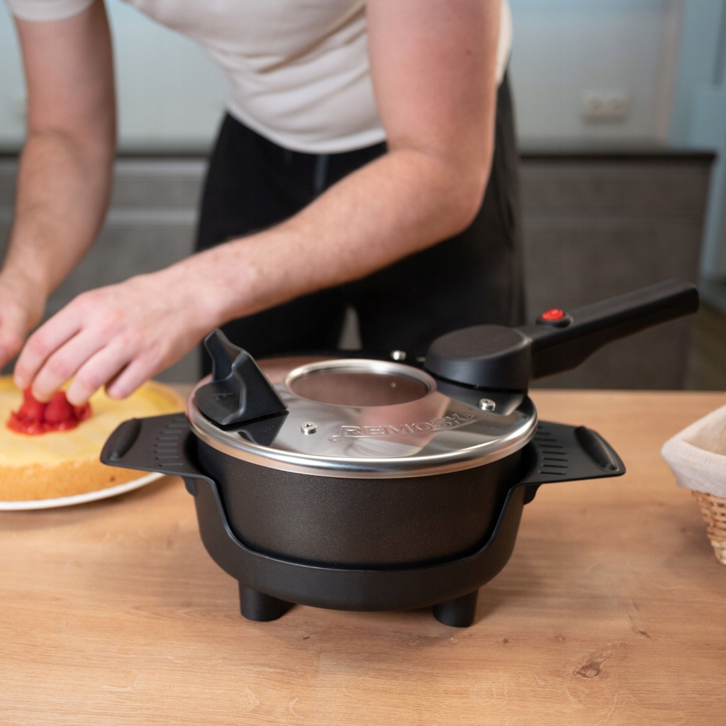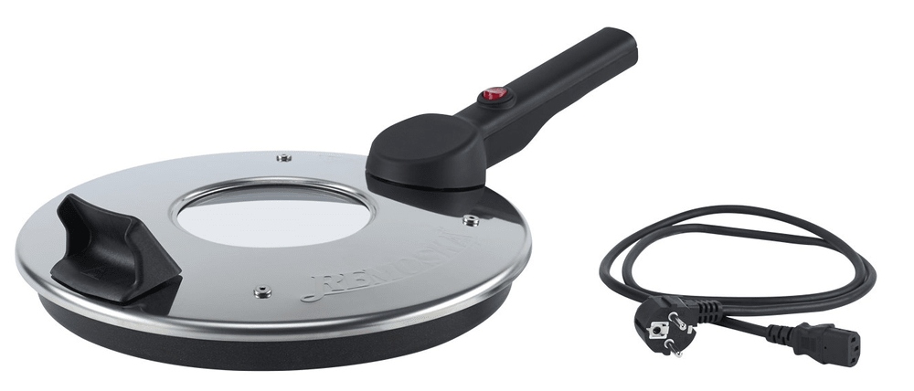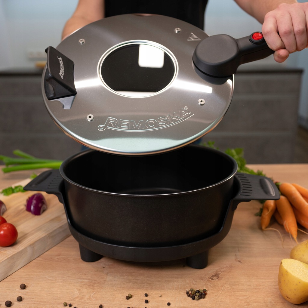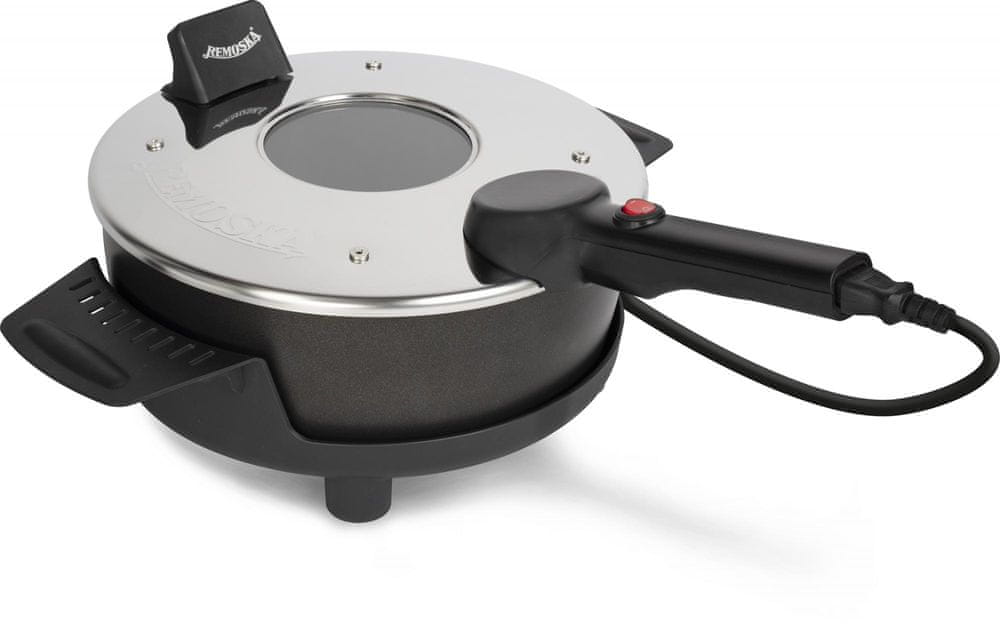 Jednak projektanci REMOSKA Prima pomyśleli również o sytuacjach, w których można otworzyć pokrywę i trzeba skoncentrować się na przygotowywanej potrawie. W takich sytuacjach pokrywa ma wbudowane elementy, które pozwalają po prostu umieścić ją na powierzchni roboczej z częścią grzewczą skierowaną do góry.