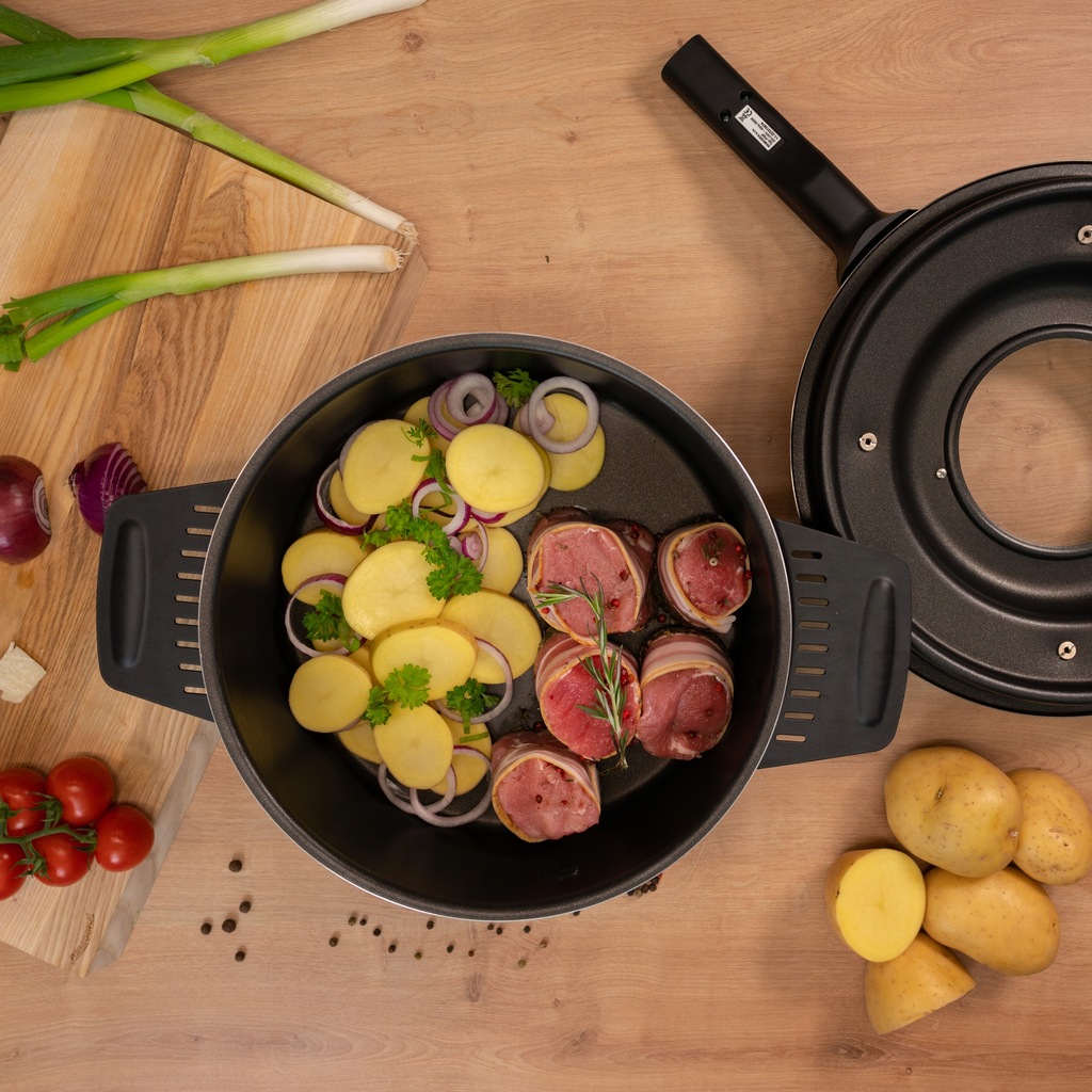 Misa prodiża REMOSKA Prima szybko rozprowadza ciepło z pokrywy do pieczenia na całe naczynie i dba o warunki do przyrumieniania potraw. Przygotowane potrawy pozostają soczyste, wilgotne i nie wysychają przy długim czasie pieczenia, jak w tradycyjnym piekarniku.