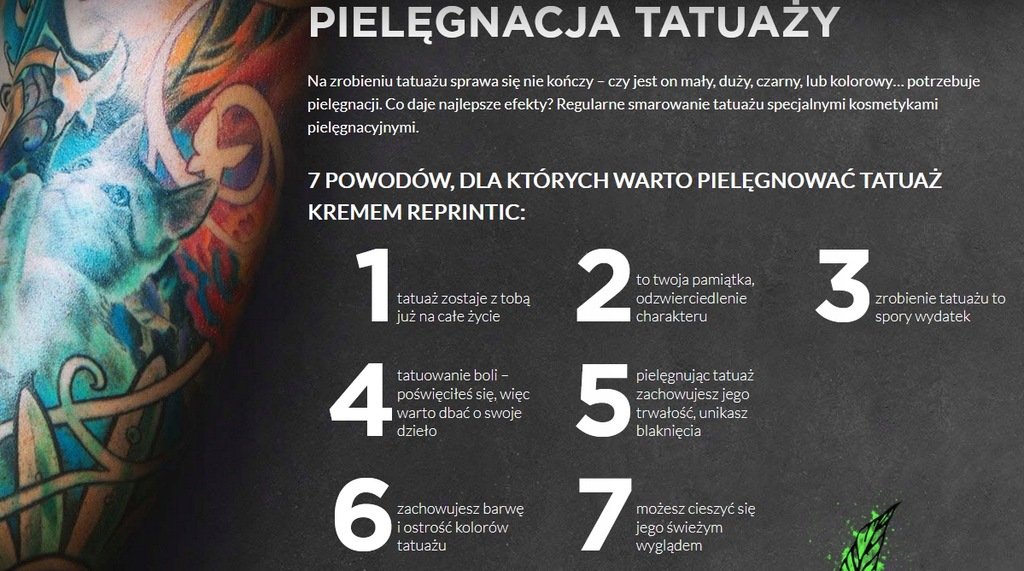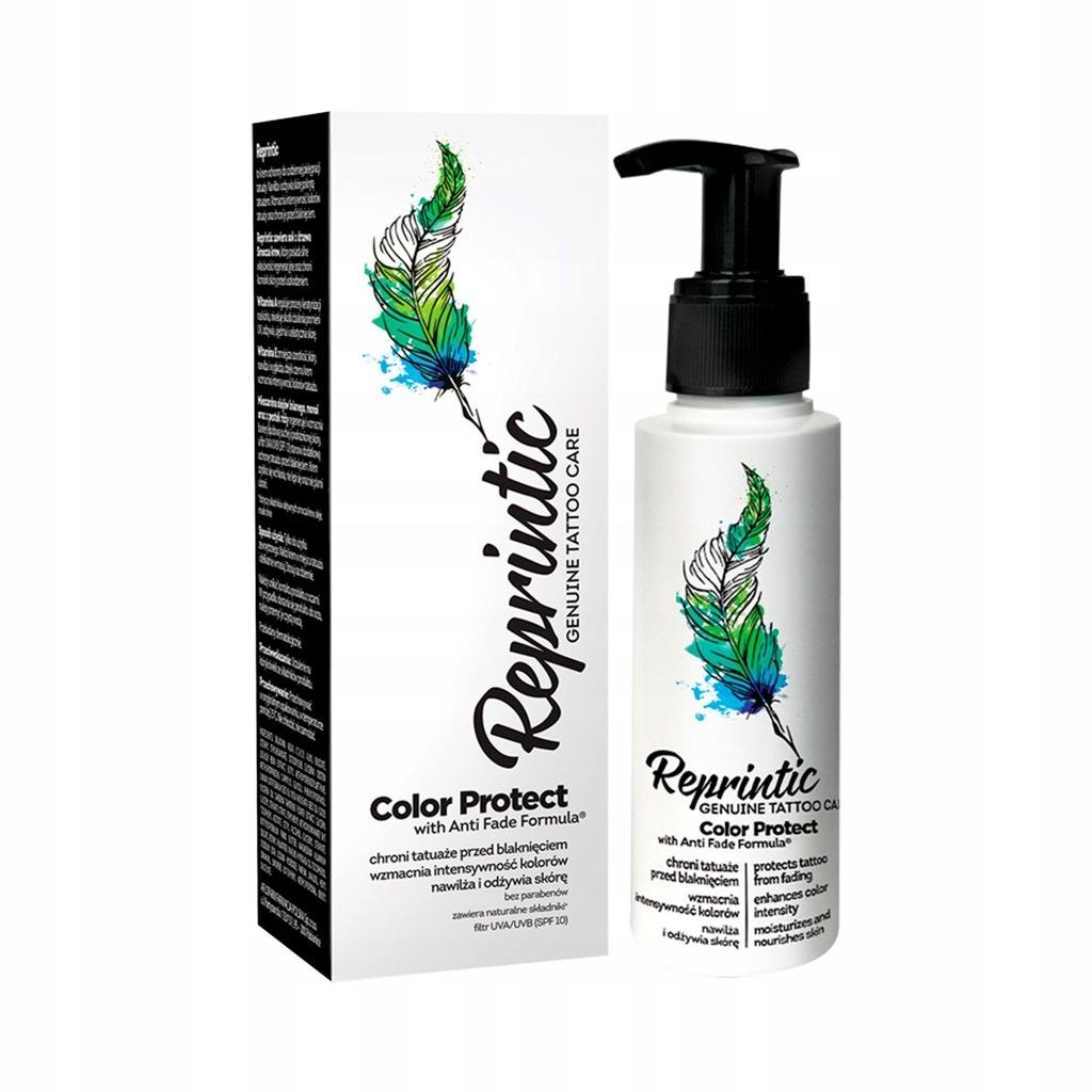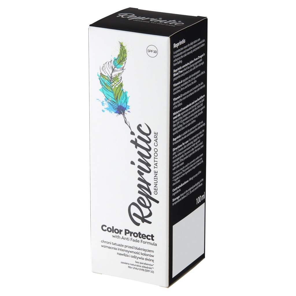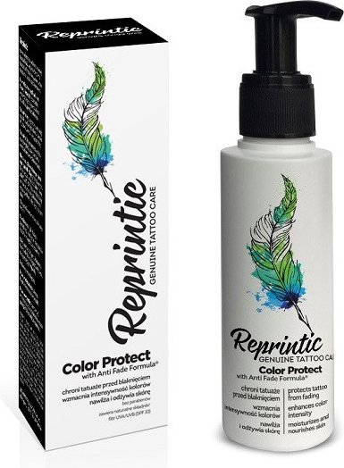 Reprintic to krem ochronny do codziennej pielęgnacji tatuaży. Nawilża i odżywia skórę pokrytą tatuażem. Wzmacnia intensywność kolorów tatuaży oraz chroni je przed blaknięciem. Reprintic zawiera sok z drzewa Smocza krew, który posiada silne właściwości regeneracyjne oraz chroni komórki skóry przed uszkodzeniem. Witamina A reguluje procesy keratynizacji naskórka, niweluje skutki działania promieni UV, odżywia, ujędrnia i uelastycznia skórę. Witamina E zmniejsza szorstkość skóry, nawilża i wygładza, dzięki czemu krem wzmacnia intensywność kolorów tatuażu. Mieszanina olejów lnianego, monoi oraz pestek róży regeneruje i wzmacnia barierę lipidową suchej i podrażnionej skóry, a filtr UVA/UVB (SPF 10) stanowi dodatkową ochronę tatuażu przed blaknięciem. Krem szybko się wchłania, nie lepi się oraz nie plami ubrań. Reprintic jest odpowiedni również do pielęgnacji makijażu permanentnego, nawilża skórę i wzmacnia intensywność jego kolorów.Przebadany dermatologicznie.