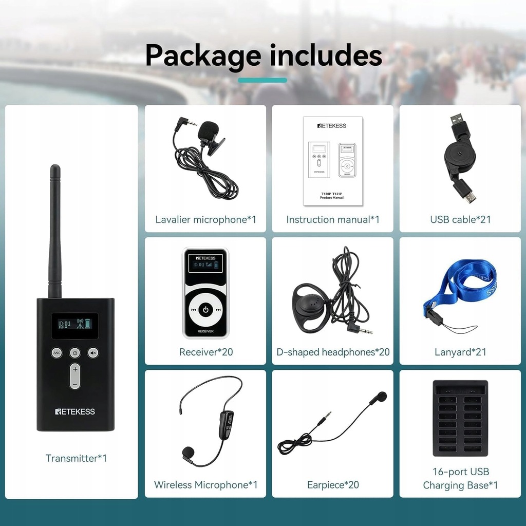 - ⭐Efficient charging base. The T130P audio guide system is equipped with a 16-slot dock for charging, which allows you to charge multiple devices simultaneously. The docking station supports contact charging, eliminating the hassle of aligning and connecting devices one by one, making charging easy and convenient.