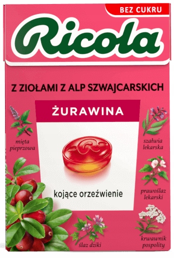 Żurawina - szwajcarskie cukierki ziołowe bez cukru, słodzone stewią. Każdy cukierek Ricola zawiera unikalną mieszankę 13 ziół uprawianych w zrównoważony sposób w szwajcarskich górach.