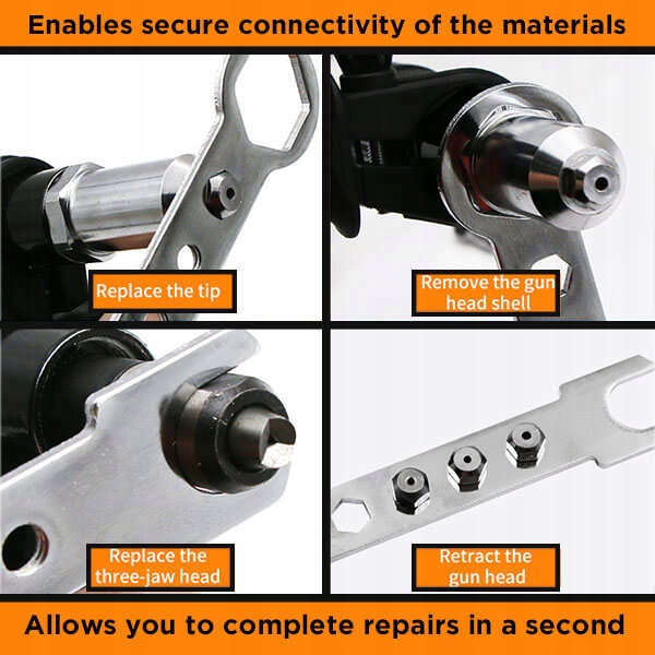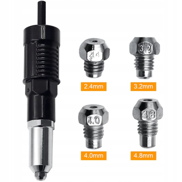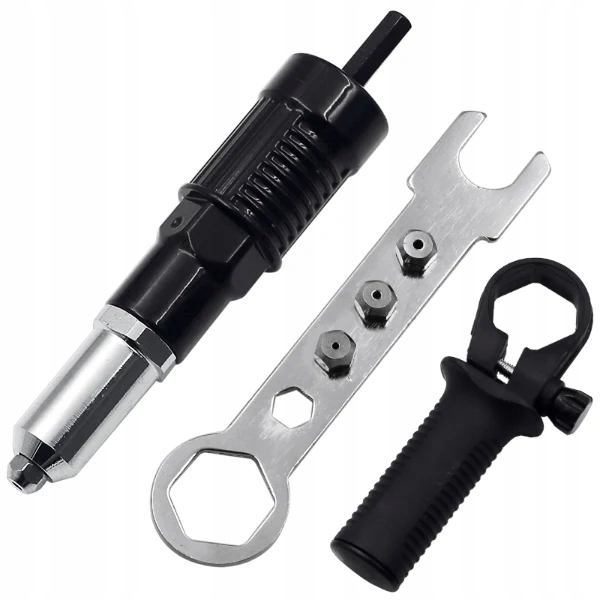 Opis produktu: Rivelo to adapter do nitów. Montuje się go na wiertarce elektrycznej. Jest lekki i łatwy w użyciu. W zestawie znajduje się pionowy uchwyt, łeb nitu, 4 końcówki do różnych rozmiarów nitów, trzy końcówki do łba nitu i klucz sześciokątny. Wystarczy umieścić pionowy uchwyt na łbie nitu i zamocować. Następnie należy wybrać odpowiednie przedłużenie i nałożyć je na łeb nitu. Przymocuj adapter do wiertarki i rozpocznij nitowanie. Aby usunąć resztę nitu, należy obrócić wiertarkę do tyłu. Nieusunięcie pozostałego nitu może spowodować zablokowanie adaptera.