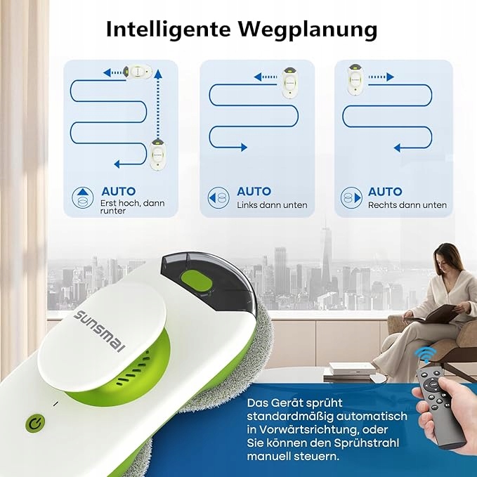 INTELIGENTNA NAWIGACJA I PEŁNA KONTROLA Robot sam planuje swoją pracę! Posiada 3 automatyczne ścieżki czyszczenia oraz automatycznie wykrywa krawędzie okna i przeszkody, dostosowując swoją trasę. Za pomocą dołączonego pilota możesz również sterować nim ręcznie i kontrolować funkcję spryskiwania.