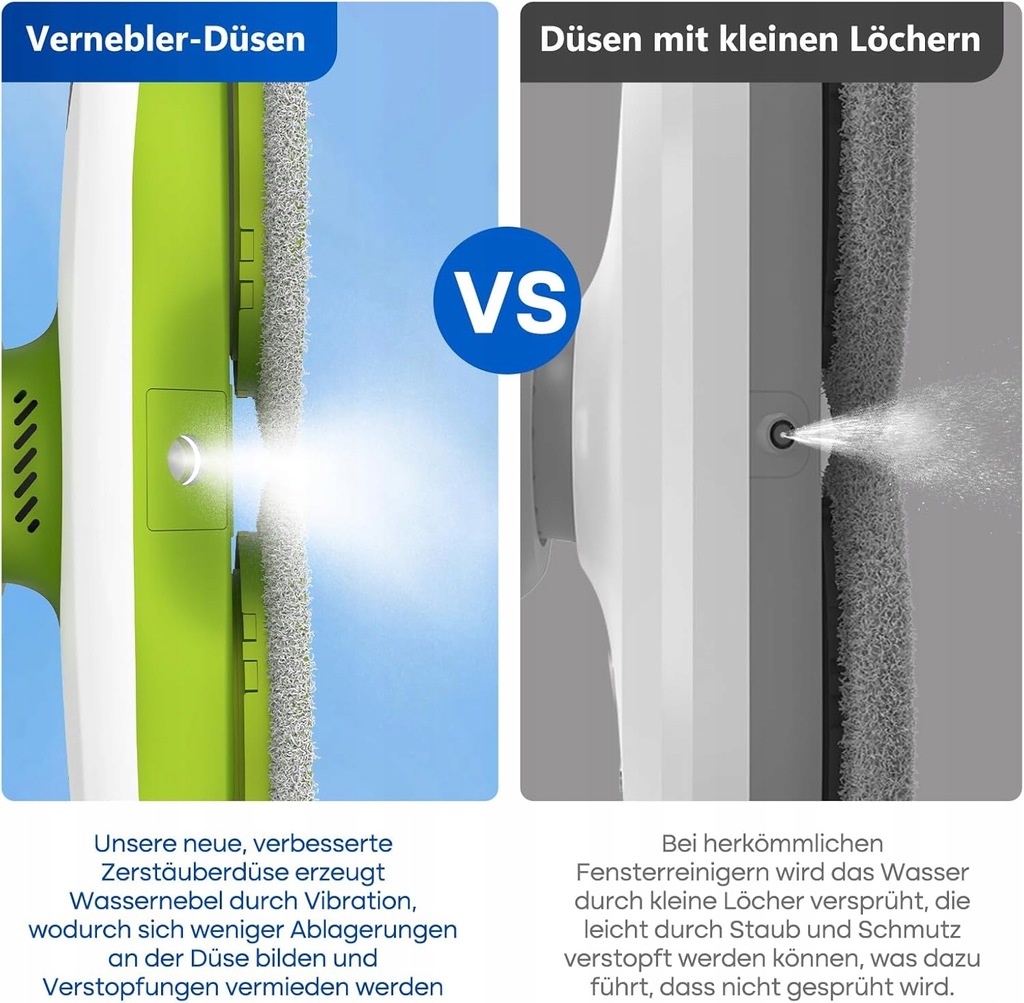 � PODWÓJNY, NIEZATYKAJĄCY SIĘ SPRYSKIWACZ To rewolucja w automatycznym myciu okien! Nasz robot, w przeciwieństwie do tradycyjnych modeli, posiada dwie dysze spryskujące, które równomiernie pokrywają powierzchnię mgiełką wodną. Co więcej, wykorzystują one technologię wibracji, która zapobiega osadzaniu się kamienia i zatykaniu, gwarantując niezawodne działanie przez długi czas.