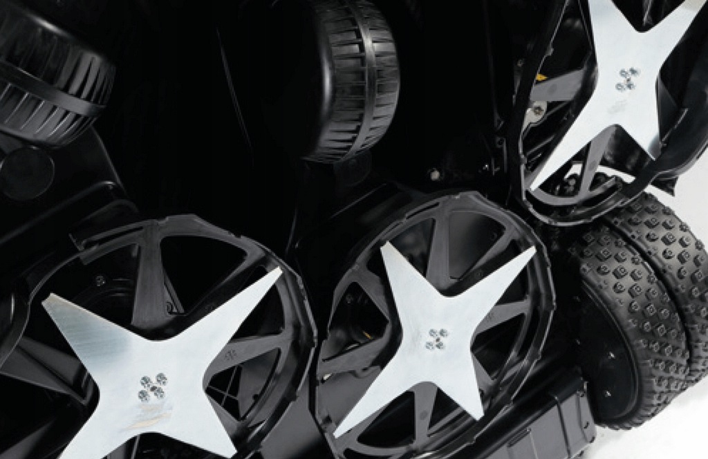Potężne tylne koła, o szczególnym profilu i ze specjalnym bieżnikiem (wyłączny patent ZCS), idealnie prowadzą robota po każdym terenie, nawet podmokłym i nie pozostawią trwałych wgnieceń na trawie i ziemi.