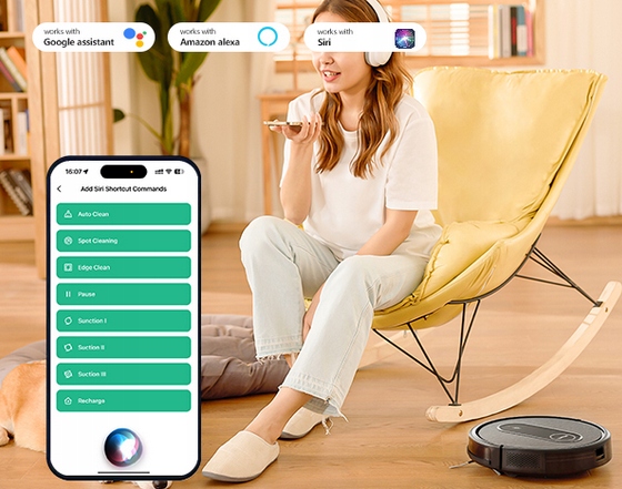 Obsługuje polecenia głosowe Siri, Alexa, IFTTT i Google Assistant. Wystarczy powiedzieć "Hey Siri", aby aktywować robot odkurzający T7 lub sterować nim w domu za pomocą Alexa, IFTTT i Google Assistant. Za pomocą aplikacji Vactidy Smart można łatwo zaplanować zadania czyszczenia, wybrać tryby czyszczenia i sterować kierunkiem czyszczenia