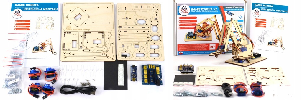 Składa się z laserowo wyciętych elementów sklejki drewnianej, mikrokontrolera zgodnego z modułem Arduino Nano, 4 serw oraz potrzebnych Ci śrubek i nakrętek.