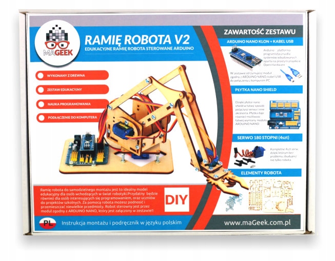 Ramię robota jest doskonałym zestawem dla początkujących, który można zbudować jedynie śrubokrętem i entuzjazmem. Jest to świetny zestaw, który pomoże Ci rozpocząć pracę w świecie programowania, elektroniki, robotyki i inżynierii!
