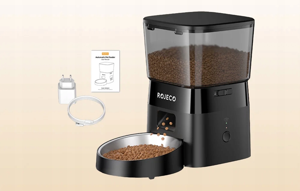 Zadbaj o zdrową dietę swojego pupila. Inteligentny dozownik karmy Rojeco cechuje się pojemnością 2 l i pozwala planować harmonogramy karmienia. Został zaprojektowany w taki sposób, aby zapobiegać blokowaniu się jedzenia i może być zasilany na 2 sposoby – z gniazdka lub za pomocą baterii (brak w zestawie). Ponadto do wykonania jego miski zastosowano wysokiej jakości stal nierdzewną, która jest bardzo wytrzymała i bezpieczna dla zdrowia. Wygodną obsługę urządzenia umożliwia dedykowana aplikacja.