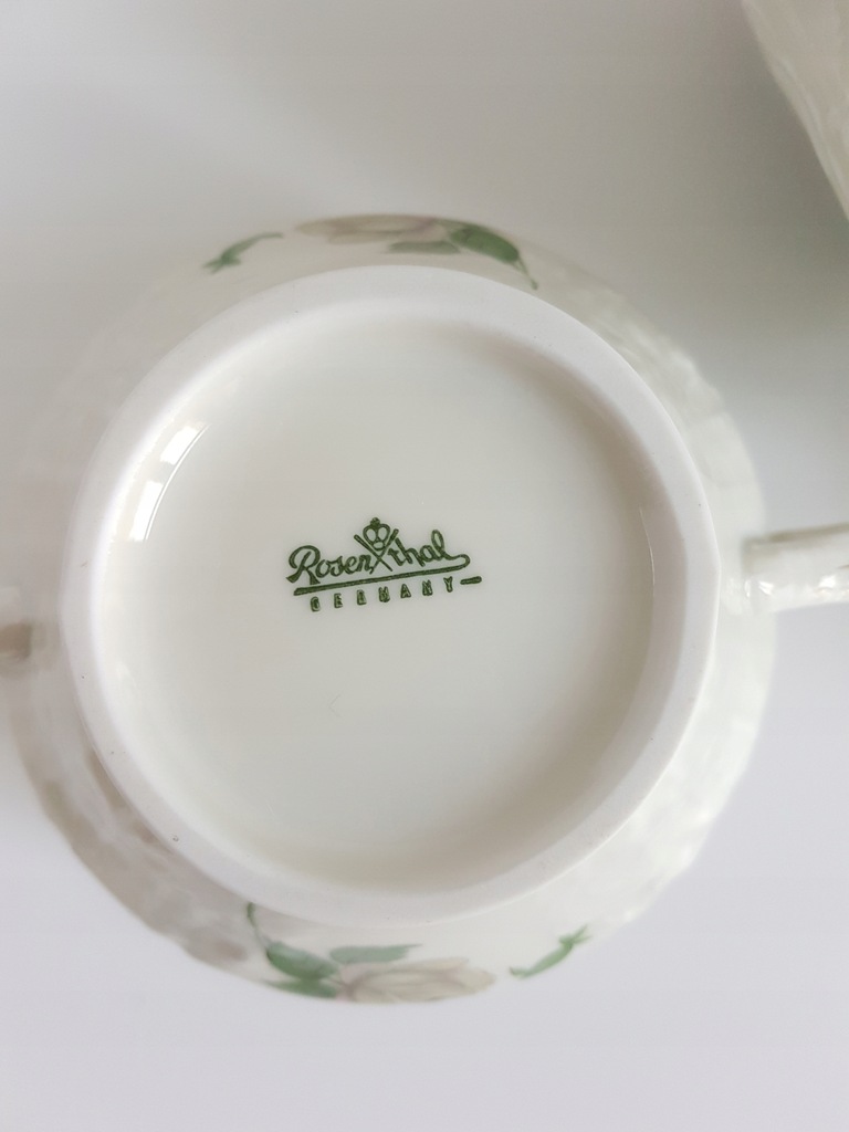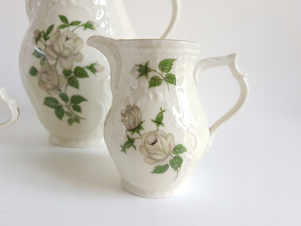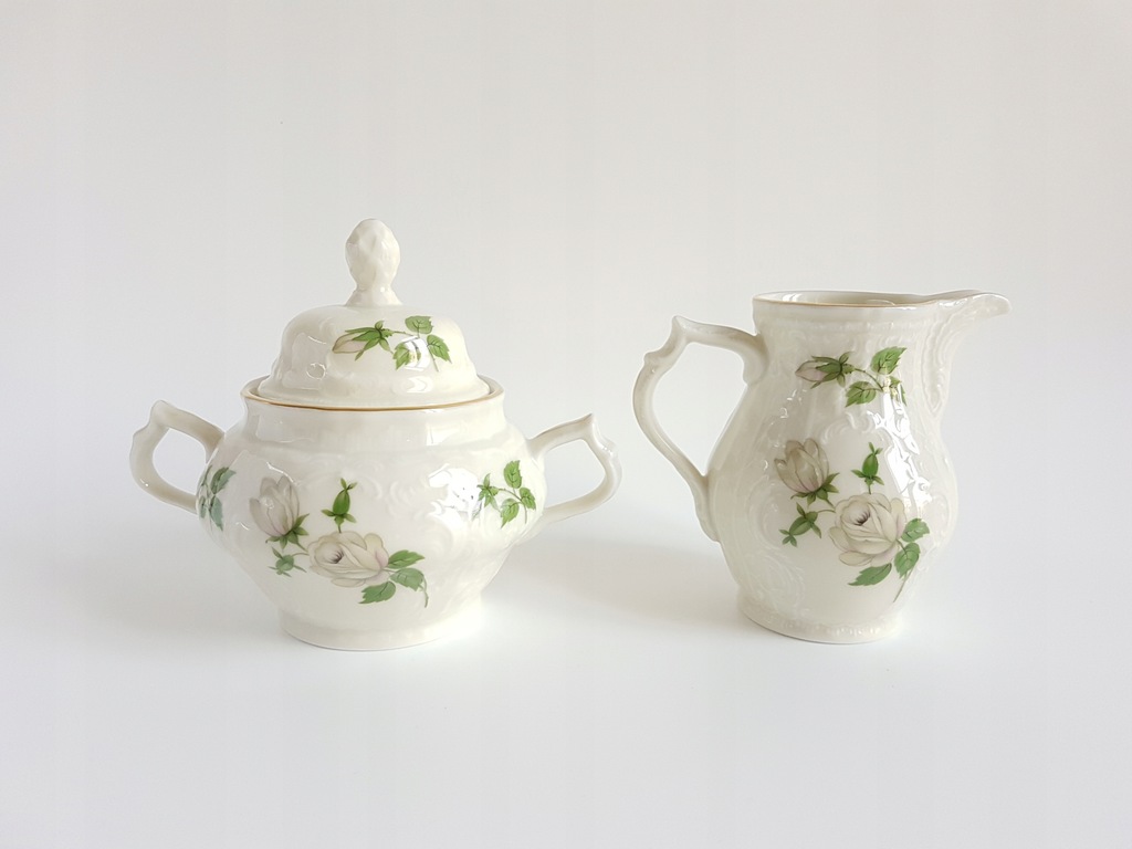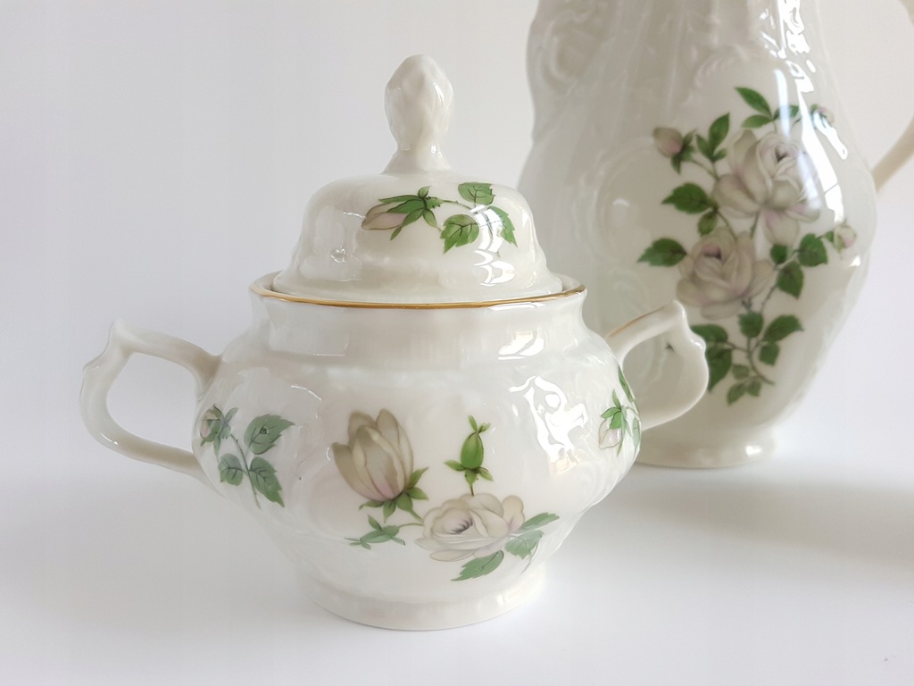 Rosenthal Sanssouci - delikatna i cienka porcelana ecru dekorowana rzadziej spotykanym motywem białej róży. Do tego piękne reliefy podkreślone subtelnymi złotymi rantami.