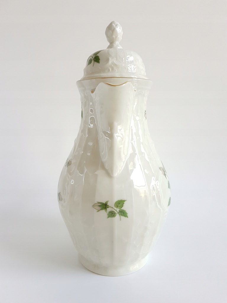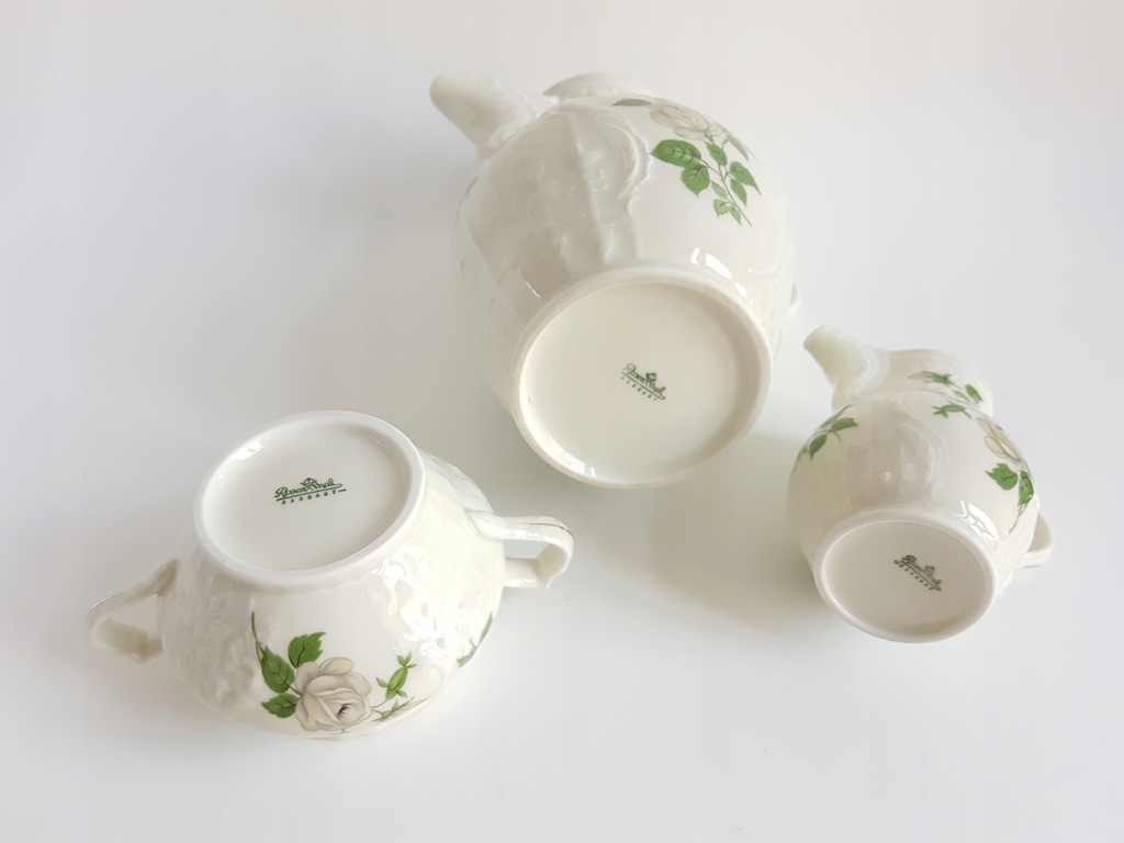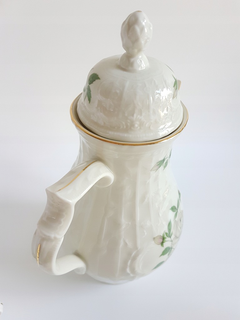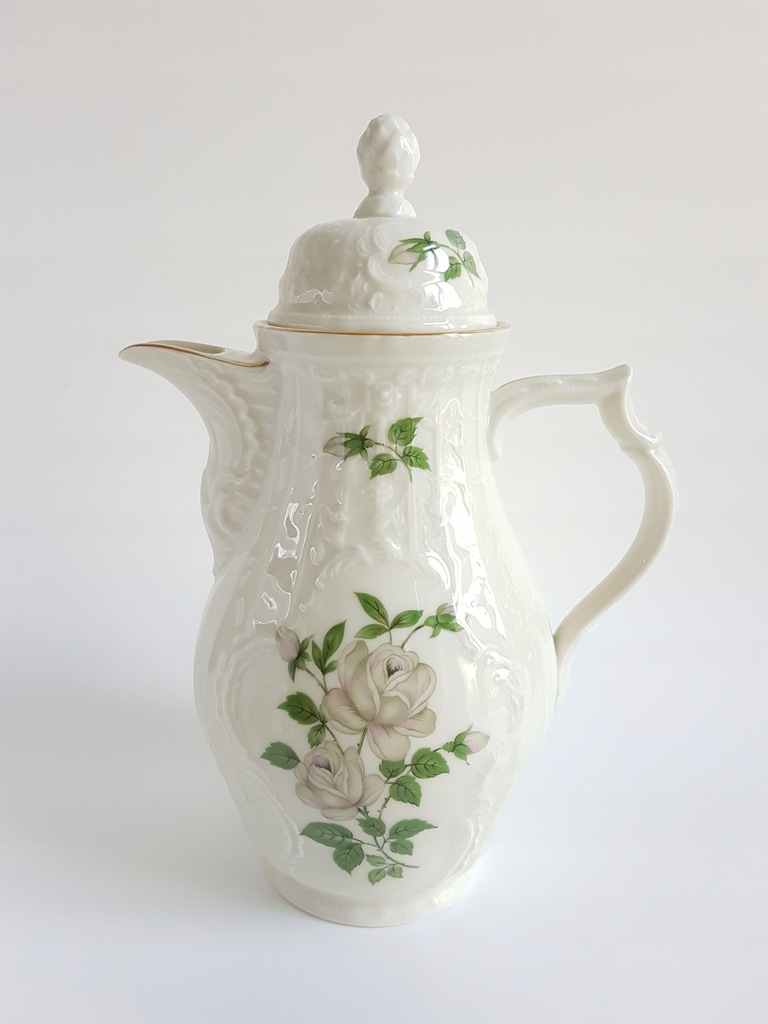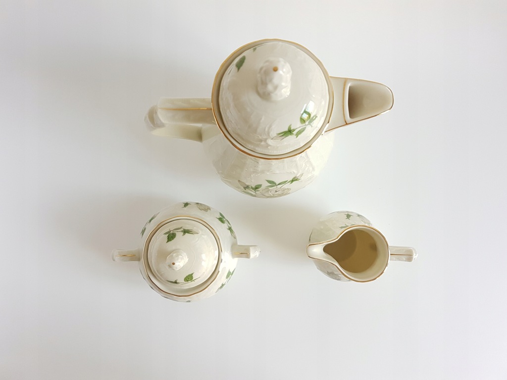 Rosenthal Sanssouci - delikatna i cienka porcelana ecru dekorowana rzadziej spotykanym motywem białej róży. Do tego piękne reliefy podkreślone subtelnymi złotymi rantami.