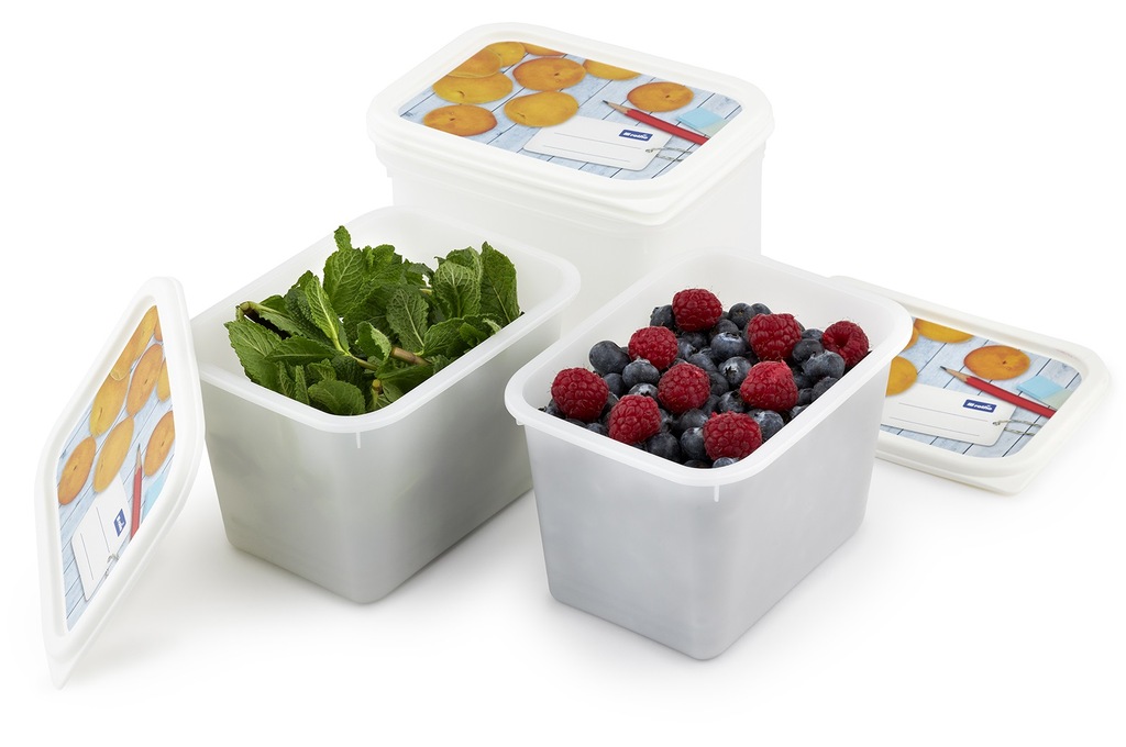 Zestaw pojemników na produkty spożywcze do mrożenia DOMINO. Pokrywa tych pojemników jest bardzo elastyczna i dobrze przylega do podstawy pudełka, dzięki czemu w tych pojemnikach możemy przechowywać produkty płynne takie jak zupy, sosy czy gulasze. Zostały one tak zaprojektowane, by można było wkładać jeden pojemnik w drugi, bądź układać jeden na drugim. Produkt można przechowywać w lodówce oraz zamrażarce (dopuszczalna temperatura to aż -40 stopni Celsjusza). Dodatkowo można je też myć w zmywarce, co jest dużym udogodnieniem.