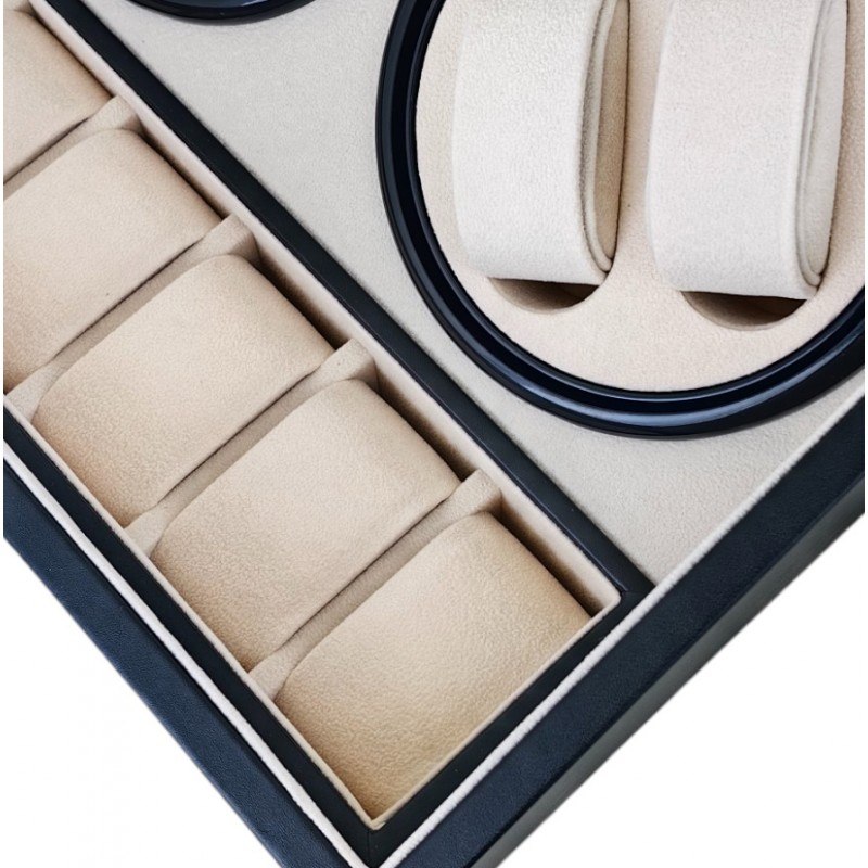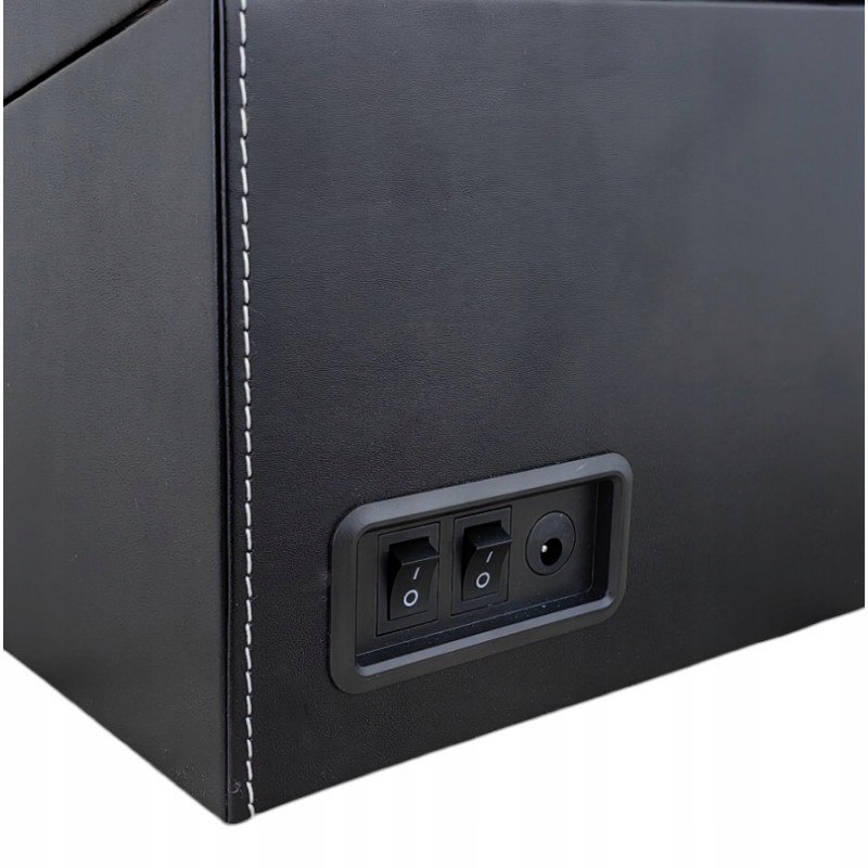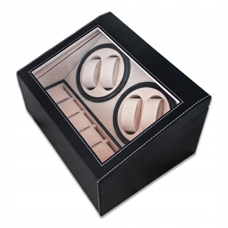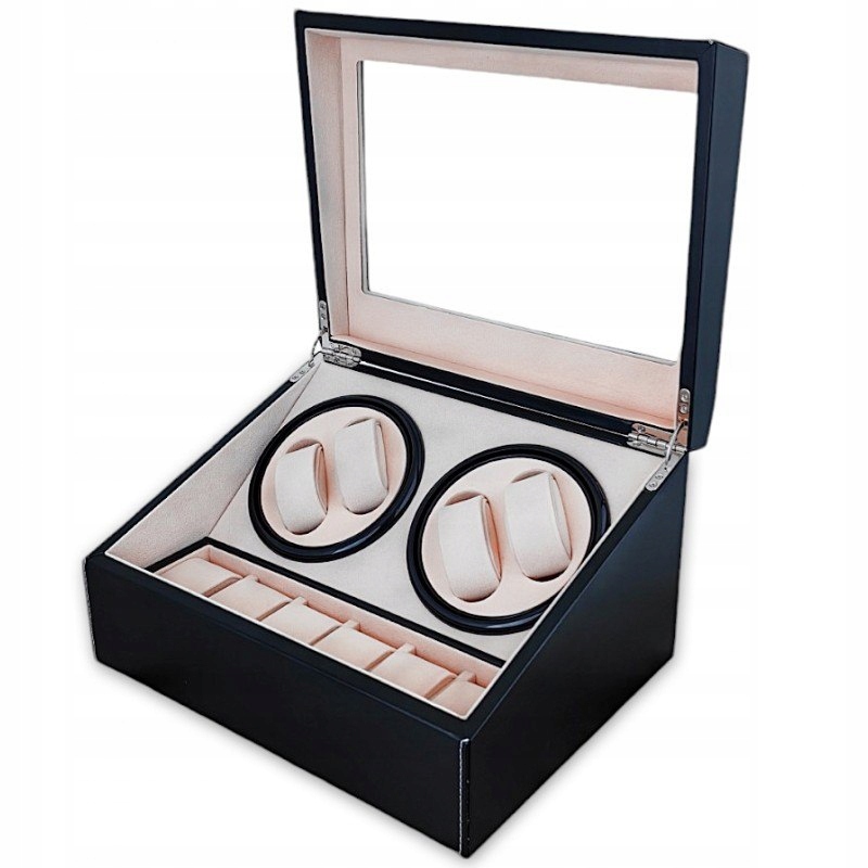 Elegancki Rotomat na 4 zegarki mechaniczne z automatycznym naciągiem Wystarczy uruchomić rotator aby obracał zegarek.Cykl obrotów to 2 minuty w jedną stronę, pauza - 6 minut, a następnie 2 minuty w drugą stronę, pauza - 6 minut.Cykle te będą się powtarzać aż do wyłączenia rotomatu.Dodatkowo posiada 6 slotów z poduszeczkami na zegarkiCechy produktu:- eleganckie wykończenie ekoskóra- wbudowany, niemal bezgłośny silnik elektryczny- wnętrze wyścielone miękką ekoskórą- szybka prezentująca zegarki- Zasilacz w zestawieWymiary:Szerokość - 31 cmGłębokość - 23,8 cmWysokość - 12,5 - 18 cmWymiary opakowania:36 cm x 29 cm x 24 cmWaga: 2,56kg netto / 3,1kg brutto