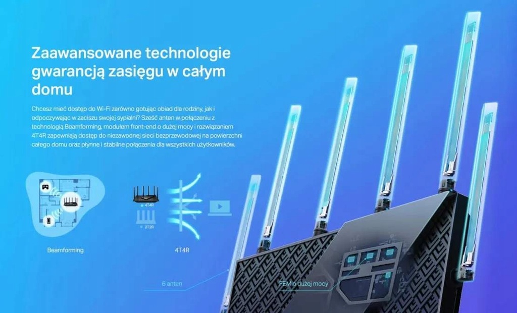 - Cztery anteny zewnętrzne o wysokim zysku w połączeniu z technologią Beamforming zapewniają dostęp do niezawodnej sieci bezprzewodowej na powierzchni całego domu oraz płynne i stabilne połączenia dla wszystkich użytkowników.