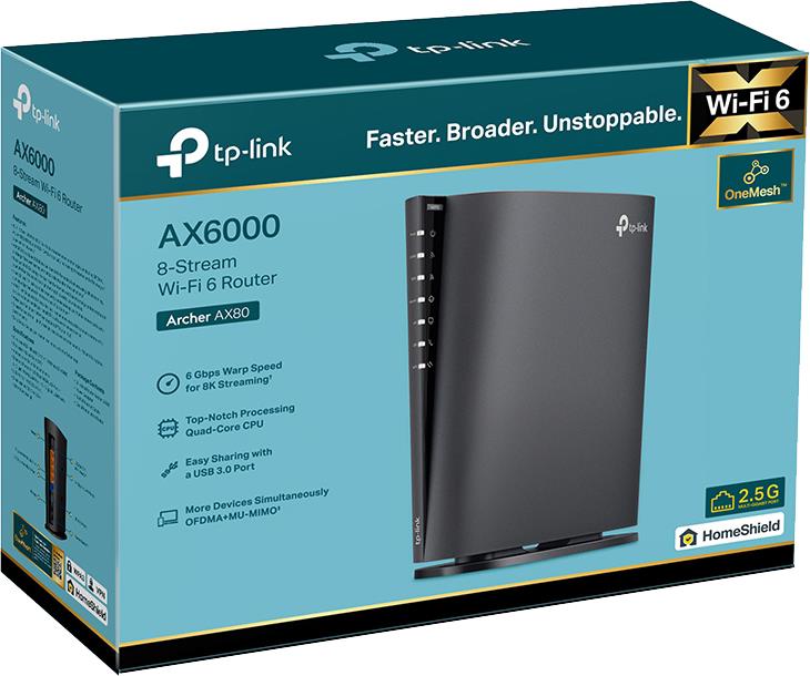 TP-LINK AX6000 8-strumieniowy router Wi-Fi 6 z portem 2.5G Archer AX80 802.11ax, 4804+1148 Mbit/s, 10/100/1000 Mbit/s, Ethernet LAN (RJ-45) porty 3, MU-MiMO Tak, brak mobilnej łączności szerokopasmowej, typ anteny Zewnętrzna, 1× port USB 3.0