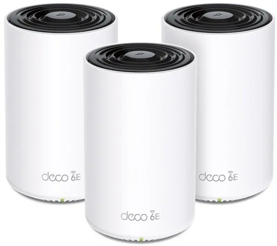 TP-Link Deco XE75 Pro (3-pack). Kolor produktu: Biały, Typ anteny: Wewnętrzne, Typ produktu: System siatki. Częstotliwość Wi-Fi: Trójpasmowy (2,4 GHz / 5 GHz / 6 GHz), Podstawowy standard Wi-Fi: Wi-Fi 6E (802.11ax), Standardy Wi- Fi: 802.11a, Wi-Fi 5 (802.11ac), 802.11b, Wi-Fi 6 (802.11ax), 802.11g, Wi-Fi 4 (802.11n), Wi-Fi 6E.... Taktowanie procesora: 1,7 GHz, Zabezpieczenie firewall: SPI Firewall, Funkcje kontroli rodzicielskiej: Na dobranoc, Profile specjalne, Pause the Internet, Time rewards, Filtr zawartości, Czas dla.... Napięcie wejściowe adaptera AC: 100 - 240 V, Częstotliwość adaptera AC: 50 - 60 Hz, Napięcie wyjściowe adaptera AC: 12 V. Szerokość produktu: 105 mm, Głębokość produktu: 105 mm, Wysokość produktu: 169 mm