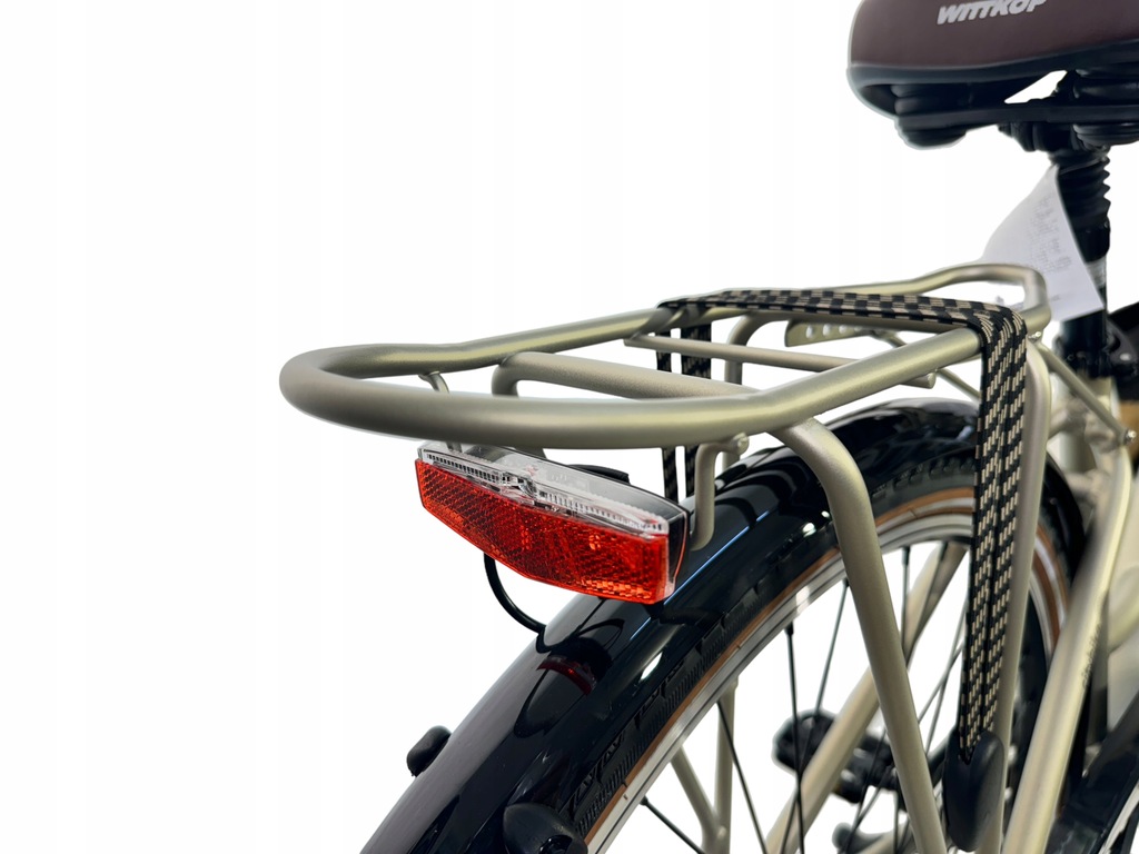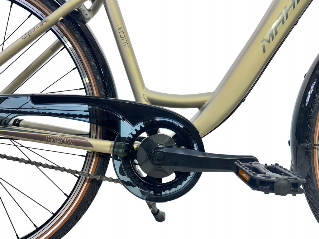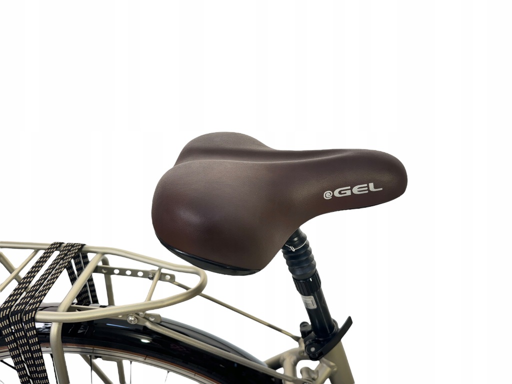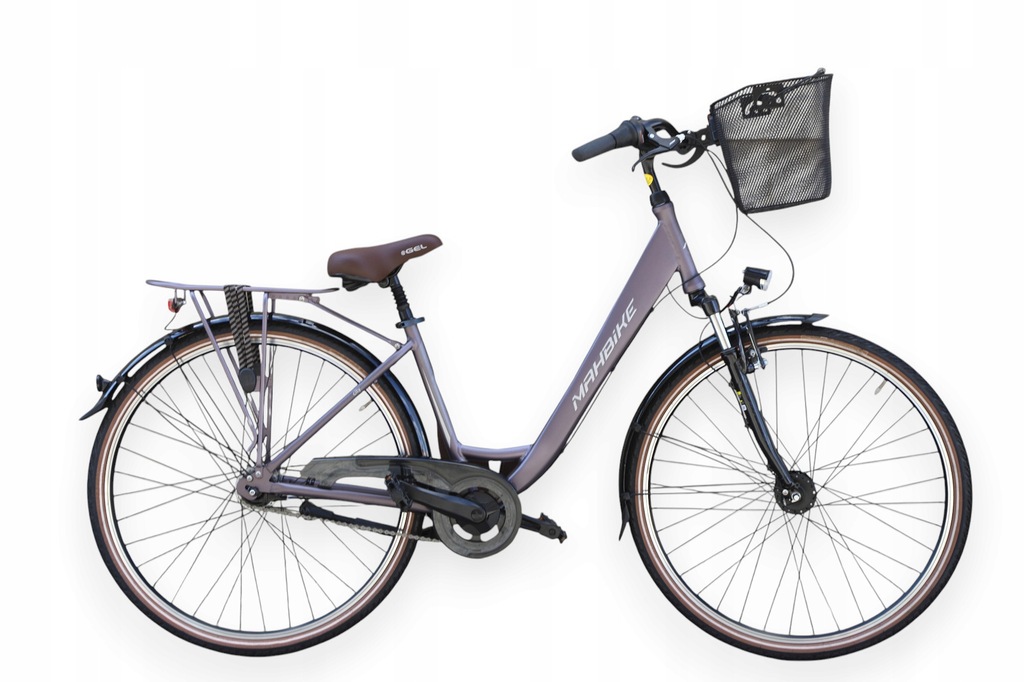 MAHBIKE to rower stworzony z myślą o komfortowej jeździe na co wpływa geometria ramy, jej profil sprawia że odległość od siedzenia do kierownicy jest dłuższa przez co bardziej komfortowa. W tym modelu spotkamy klasyczne 7 przerzutek wewnętrznych marki Shimano NEXUS, oświetlenie zasilane z prądnicy Shimano Nexus Ledowe, 2 hamulce V-brake, ramę aluminiową, czarno-brązowe opony z odblaskowym paskiem oraz siodełkow Wittkop Gel. Wygląd roweru podkreślą dodatki czyli kolor bagażnika oraz błotników w kolorze ramy oraz całość dopełnią brązowe elementy. Sugerowany wzrost użytkownika to 155 cm - 180 cm. Gratis otrzymują państwo dzwonek oraz stopkę.