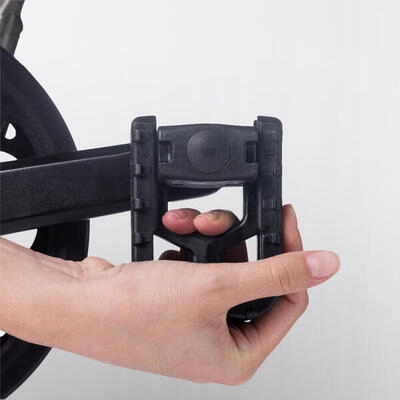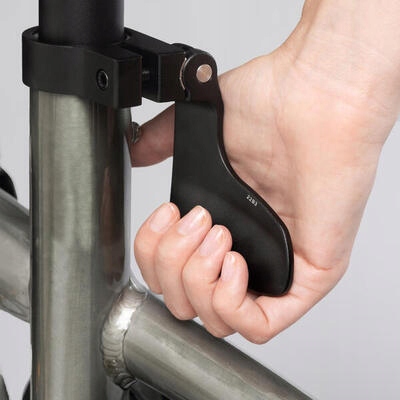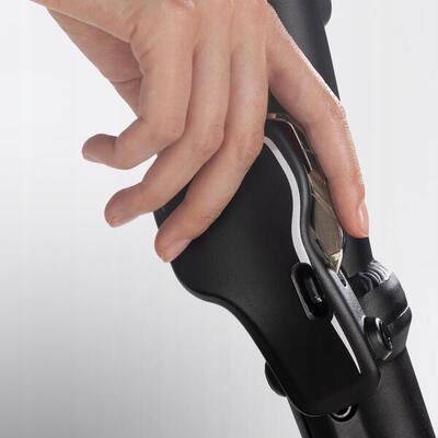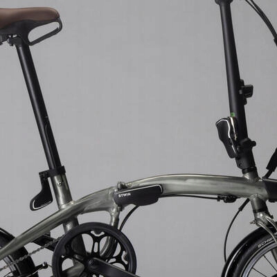 Chcemy, aby przemiany roweru były proste, szybkie i płynne, ułatwiając fazy składania i rozkładania. ROZKŁADANIE: niewiarygodne, 1 ruchem i w 1 SEKUNDĘ! Na tym etapie nie ma potrzeby obsługi zawiasów, dzięki systemowi automatycznej blokady zawiasów, opatentowanemu i dostępnemu wyłącznie w Decathlon. SKŁADANIE: Charakterystyczne kształty dźwigni zawiasów zapewniają łatwą i przyjemną obsługę. Duże uchwyty z zaokrąglonymi krawędziami umożliwiają przyjemny chwyt całą ręką.