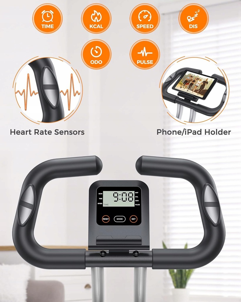 - 【Komputer z dużym ekranem i monitor tętna】 Wyposażony w duży ekran wbudowane czujniki dokładnie monitorują czas, liczbę, odległość, prędkość na minutę, kalorie i puls oraz sprawiają, że dane treningowe są łatwo widoczne.